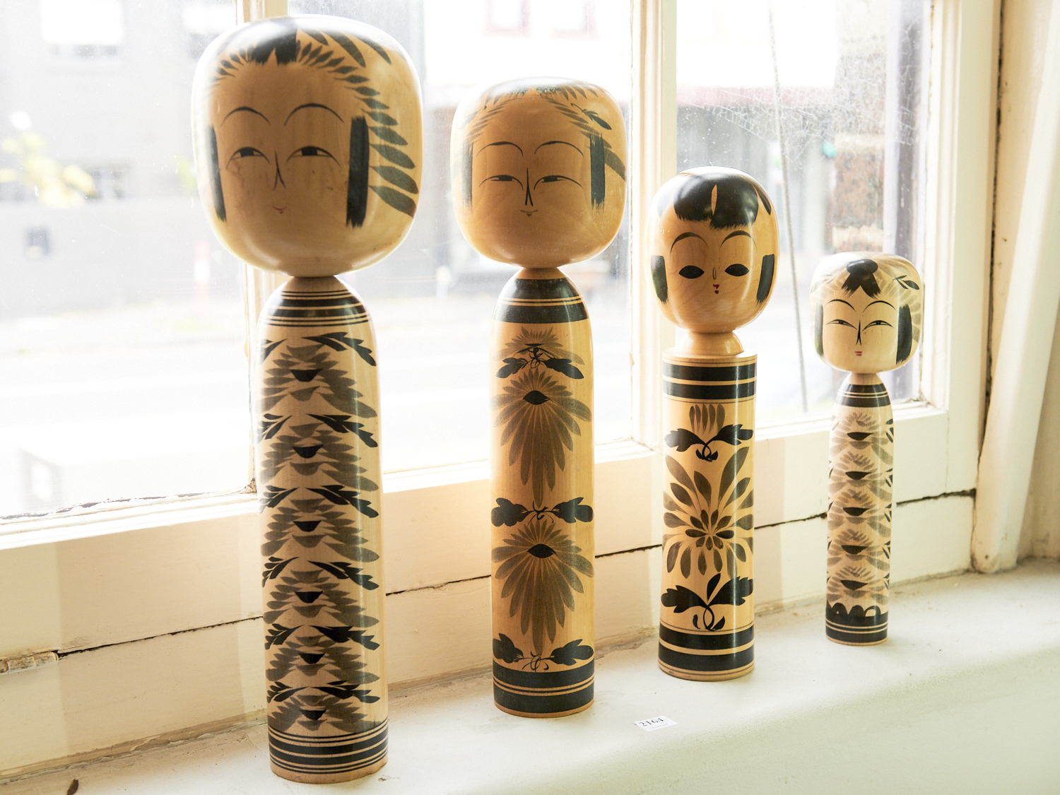 FOUR LARGE HAND PAINTED BLACK DETAILED WOODEN KOKESHI DOLLS H.45CM (TALLEST), LEONARD JOEL DELIVERY SIZE: MEDIUM