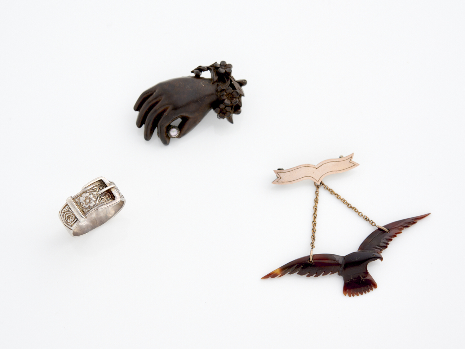 A COLLECTION OF VICTORIAN JEWELLERY INCLUDING A BUCKLE RING IN SILVER, AN EAGLE BROOCH IN 9CT GOLD AND A HAND BROOCH IN WOOD, RING SIZE R-S