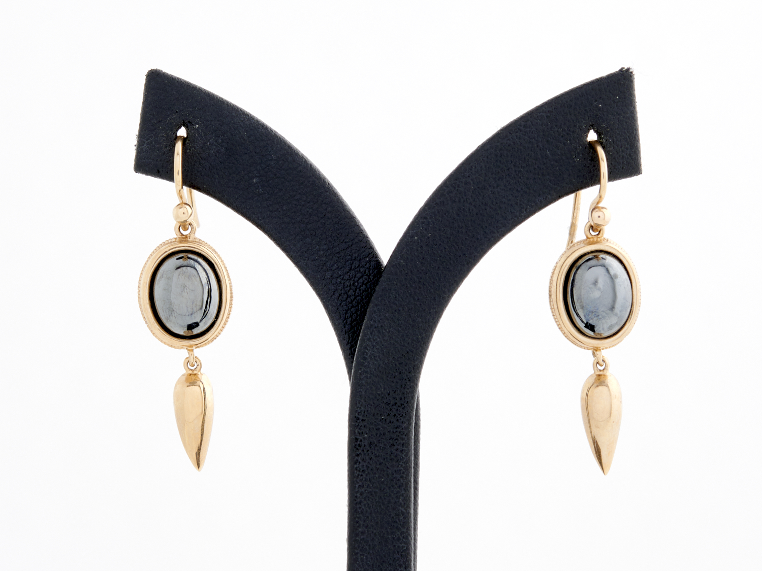 A PAIR OF HEMATITE PENDANT EARRINGS IN 9CT GOLD, TO SHEPHERD HOOK FITTINGS