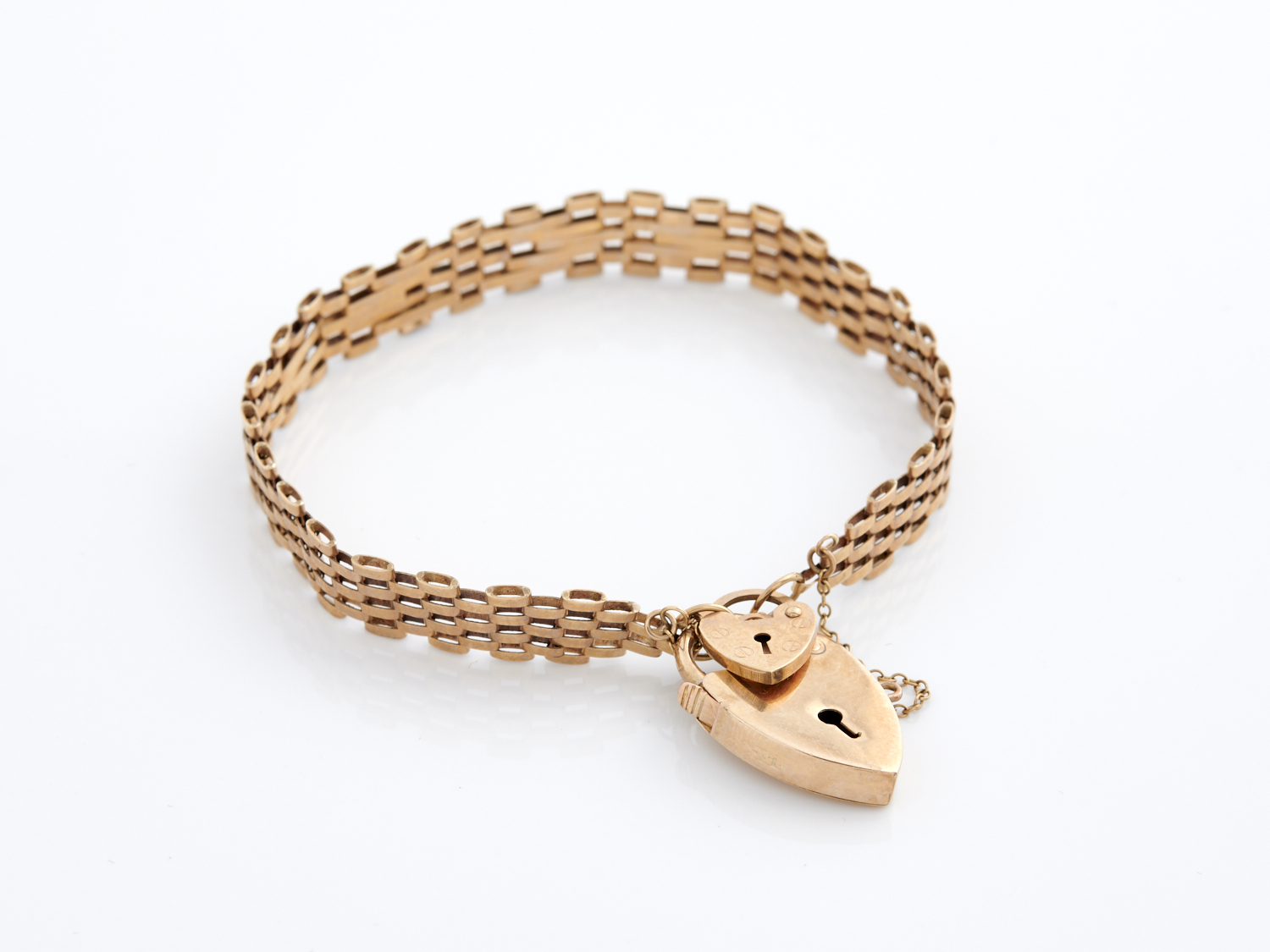 A BRICK LINK BRACELET IN 9CT GOLD, TOGETHER WITH TWO HEART PADLOCK CLASPS, 8.1GMS