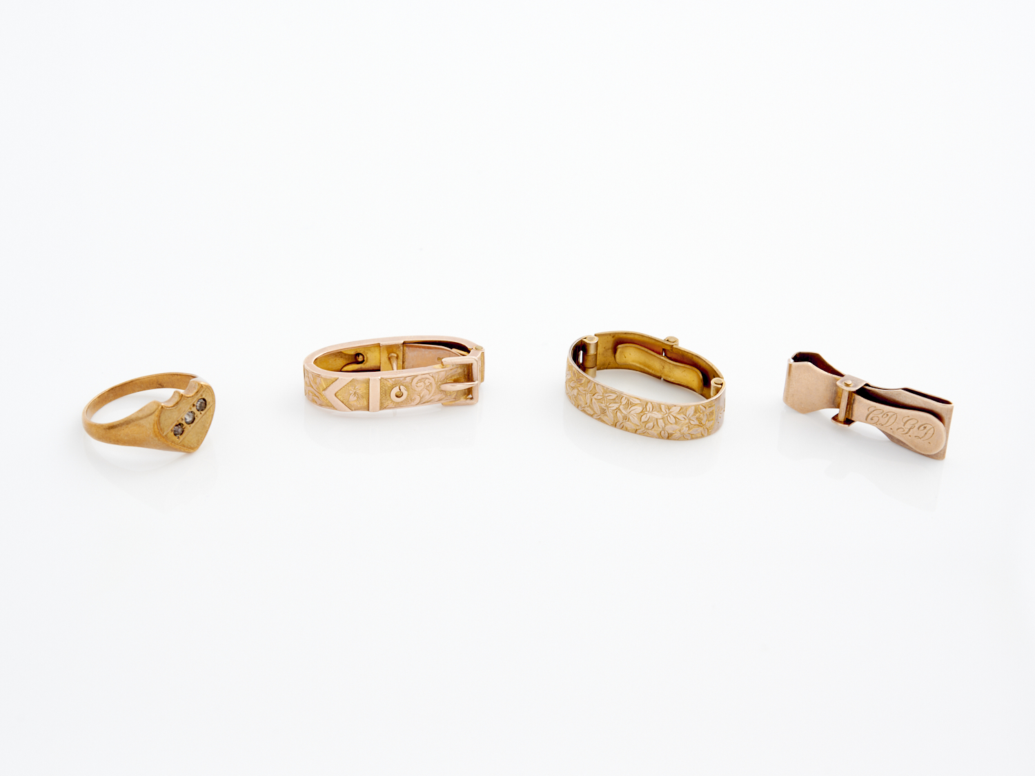 A COLLECTION OF ANTIQUE JEWELLERY INCLUDING TWO SCARF CLIPS ONE IN 9CT GOLD, A TIW-BAR IN GOLD PLATE AND A SIGNET RING IN GOLD PLATE, RING SIZE R