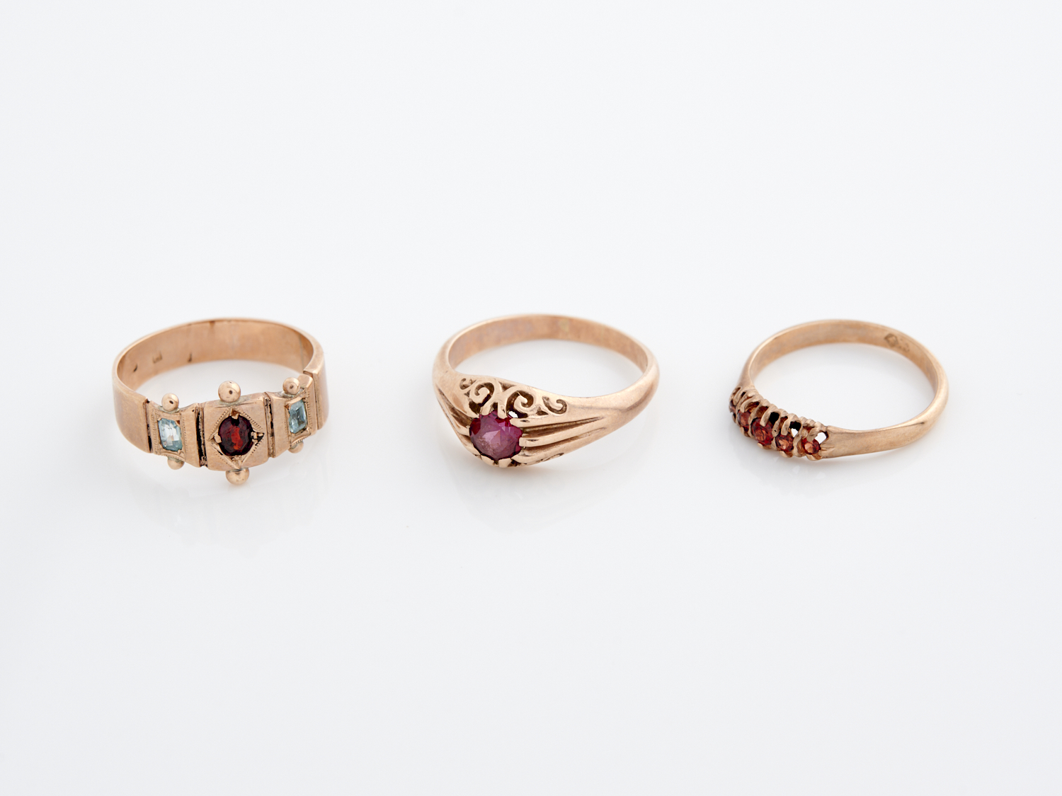 THREE GEM-SET RINGS IN 9CT GOLD, RING SIZES M, O AND P, 9.2GMS