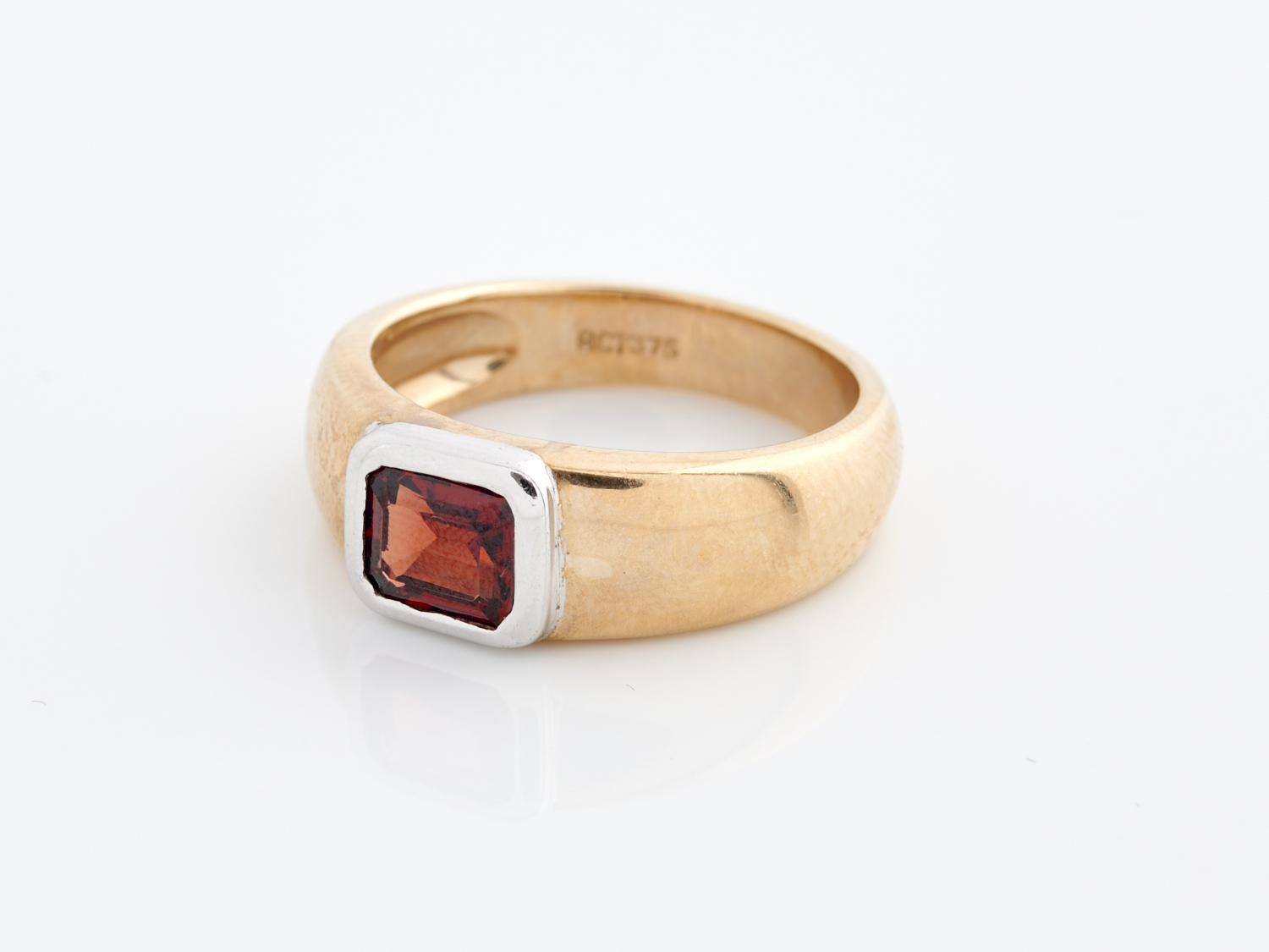 A GARNET RING IN 9CT GOLD, SIZE N, 5.6GMS