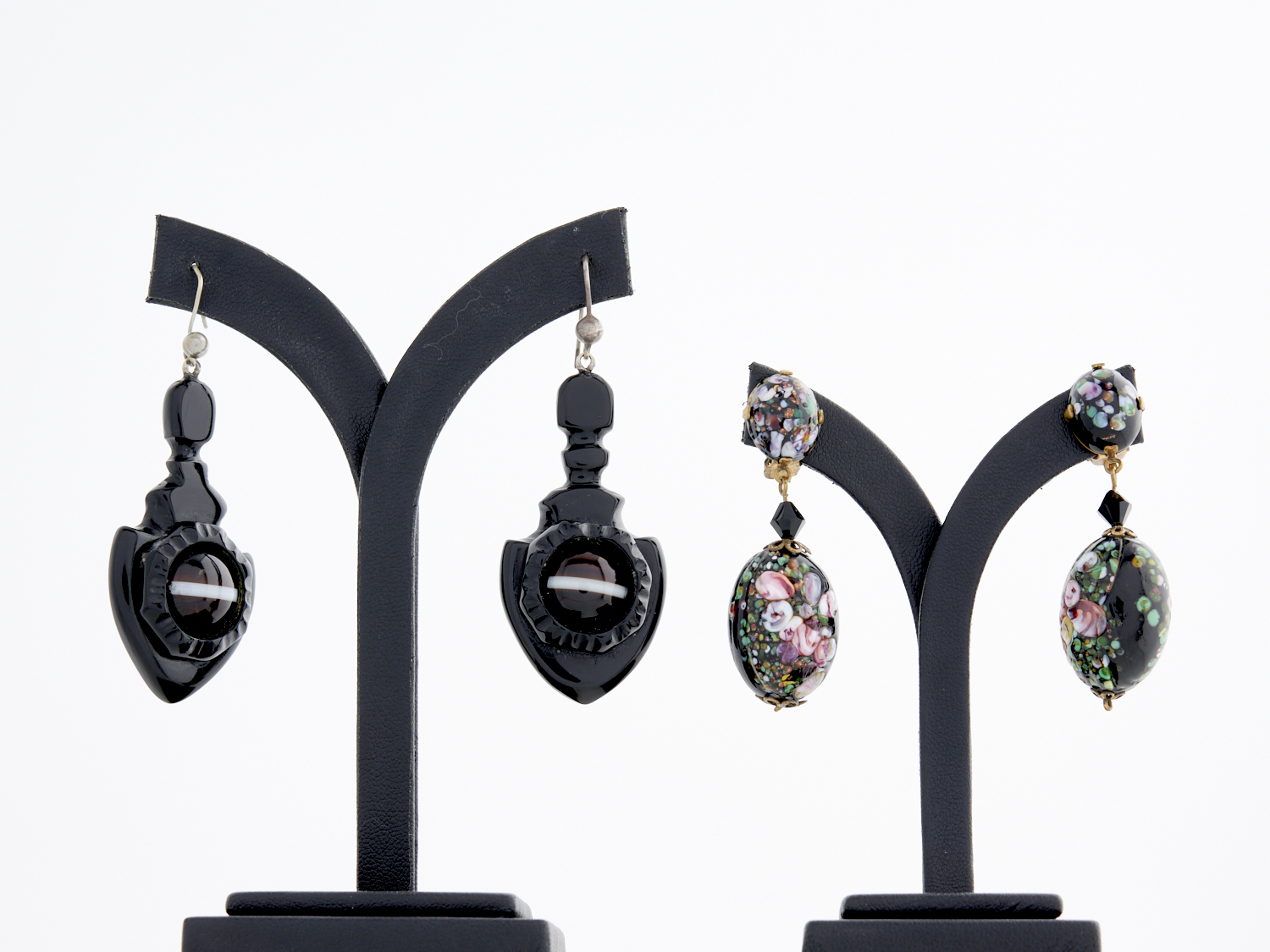 A PAIR OF BANDED AGATE SET MOURNING EARRINGS, TOGETHER WITH A PAIR OF VENETIAN GLASS EARRINGS, TO SHEPHERDS HOOK AND CLIP ON FITTINGS