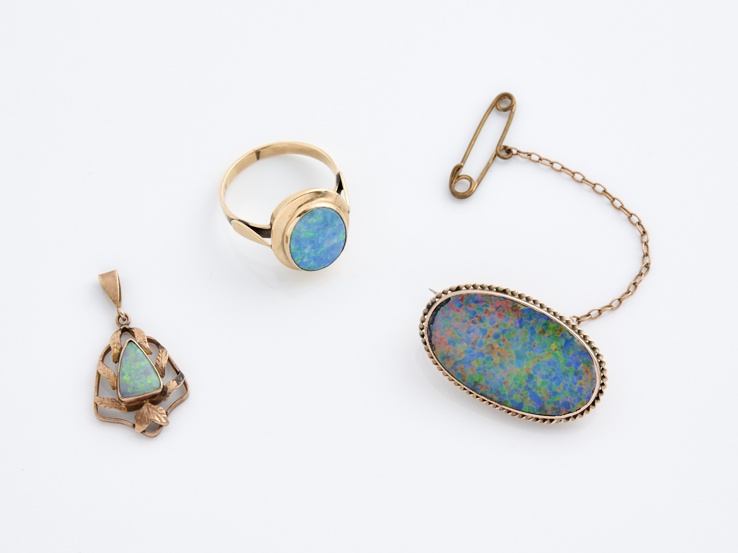 AN OPAL DOUBLET SET JEWELLERY SUITE IN 9CT GOLD, THE BROOCH SIGNED SIGNED DUMBRELLS, RING SIZE M-N