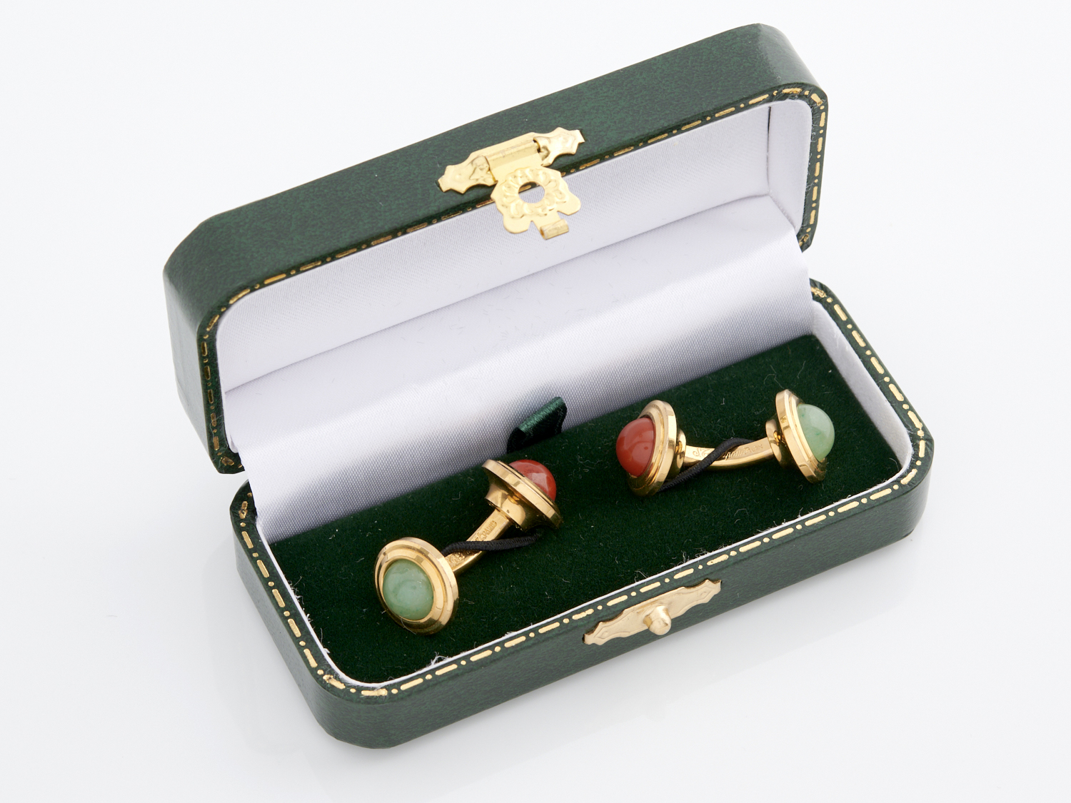 A PAIR OF FRENCH GEM SET CUFFLINKS IN GOLD PLATE, BY DUPONT, BOXED