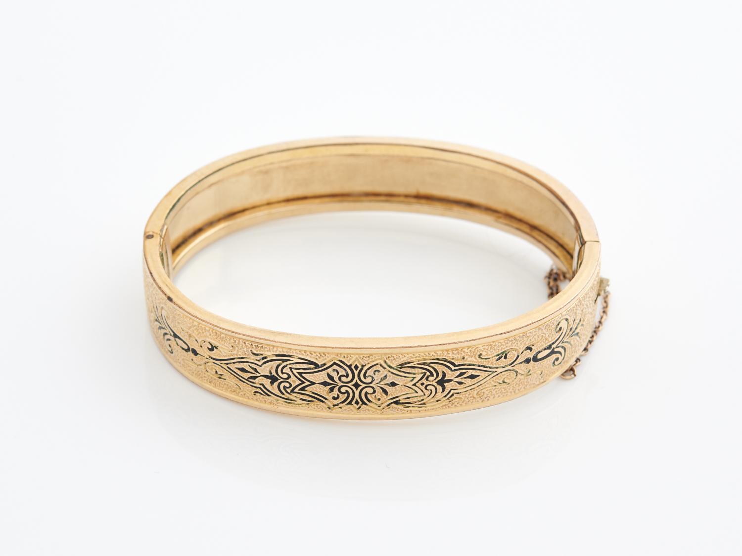 AN ANTIQUE ENAMELLED CUFF IN GOLD LINED METAL, INNER MEASUREMENTS 55 X 42MM