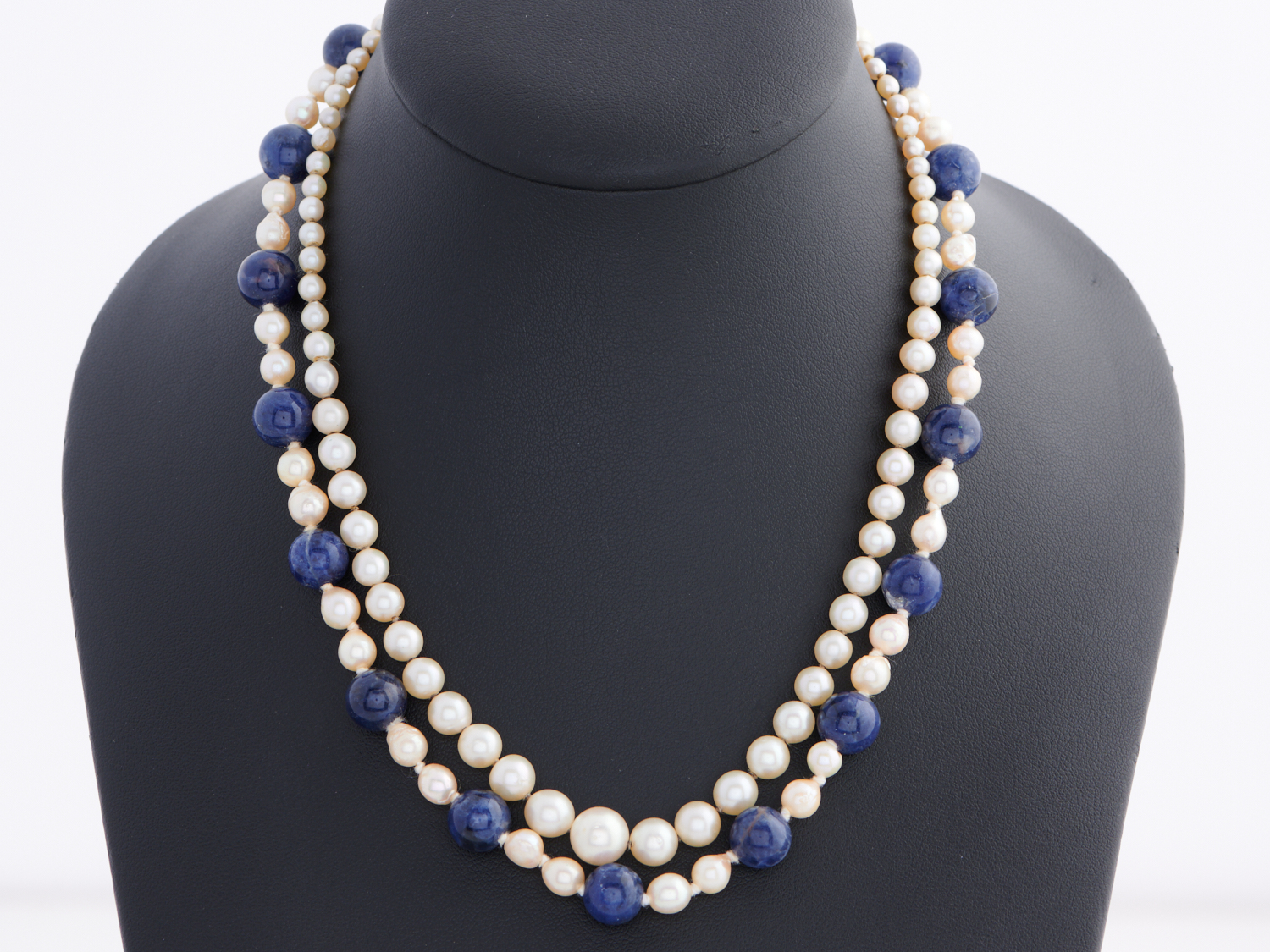 A STAND OF GRADUATED CULTURED PEARLS TO A MARCASITE CLASP IN STERLING SILVER, TOGETHER WITH A STRAND OF CULTURED PEARLS AND SODALITE BEADS