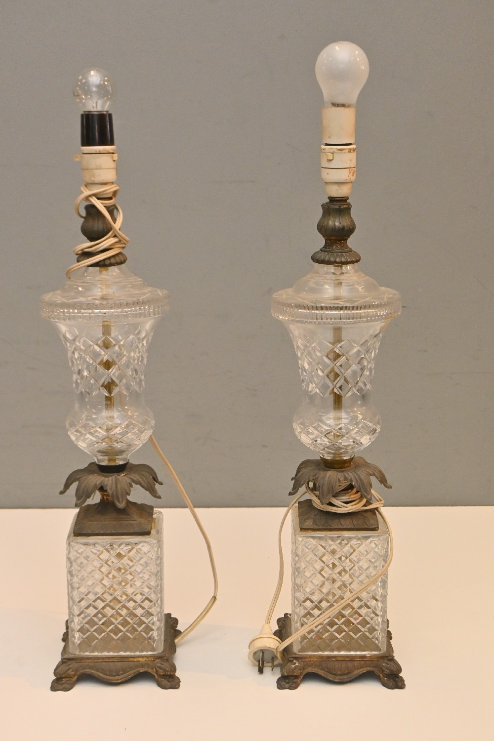 A PAIR OF GLASS TABLE LAMPS - UNTESTED (A/F) (68H CM) (LEONARD JOEL DELIVERY SIZE: LARGE)