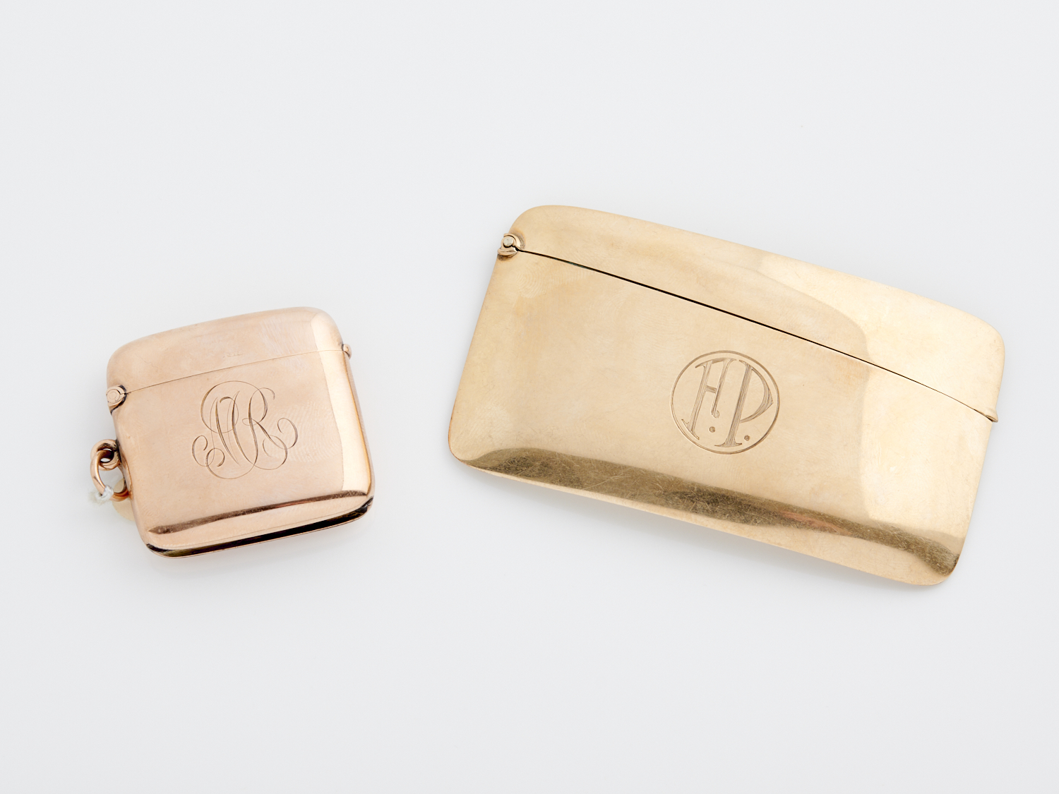A CARD CASE AND VESTA CASE IN 9CT GOLD, CHESTERFIELD HALLMARKS, 64.5GMS