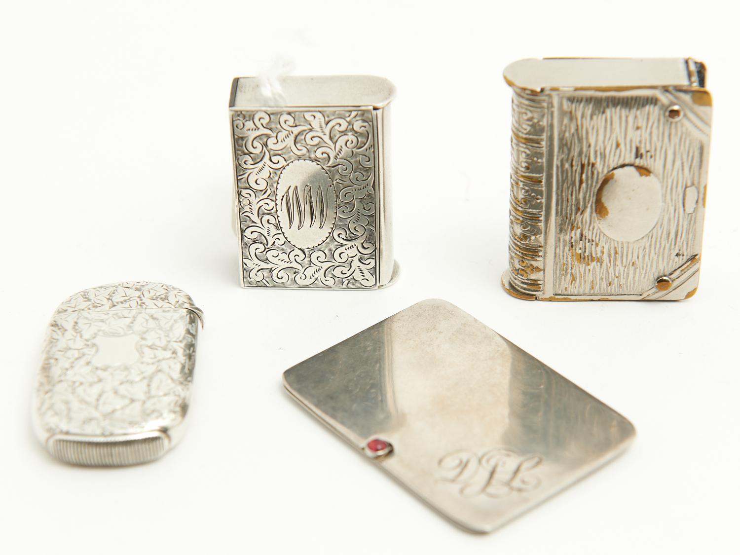 THREE VESPA CASES INCL. ONE BRITTANIA SILVER, ONE STERLING SILVER AND ONE SILVER PLATE EXAMPLE, WITH A STERLING SILVER AND CABACHON RUBY STAMP CASE L.5.2CM, LEONARD JOEL DELIVERY SIZE: SMALL
