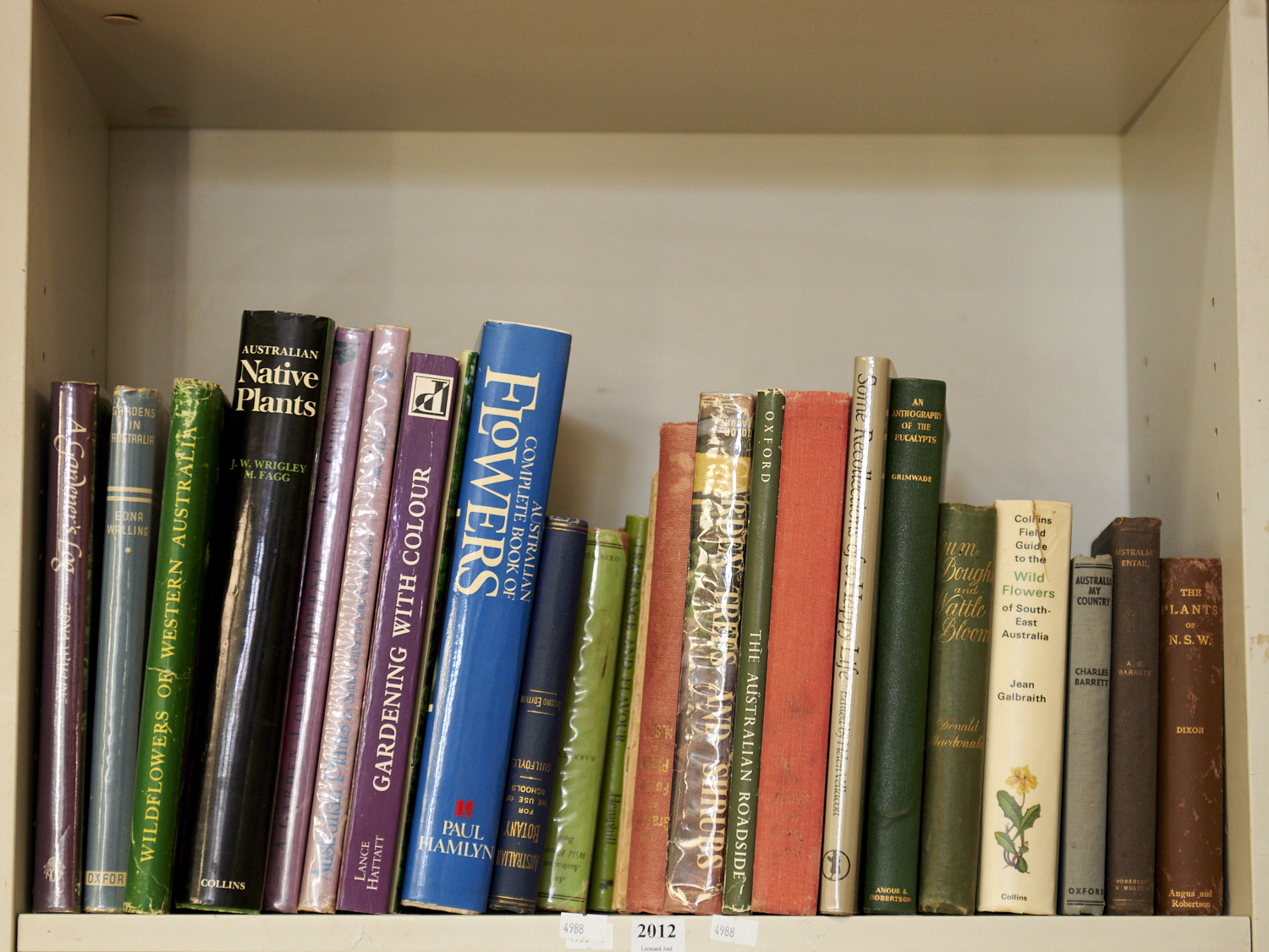 TWO SHELVES OF VINTAGE AND LATER BOOKS ON GARDENING AND GARDENING IN AUSTRALIA, LEONARD JOEL DELIVERY SIZE: MEDIUM