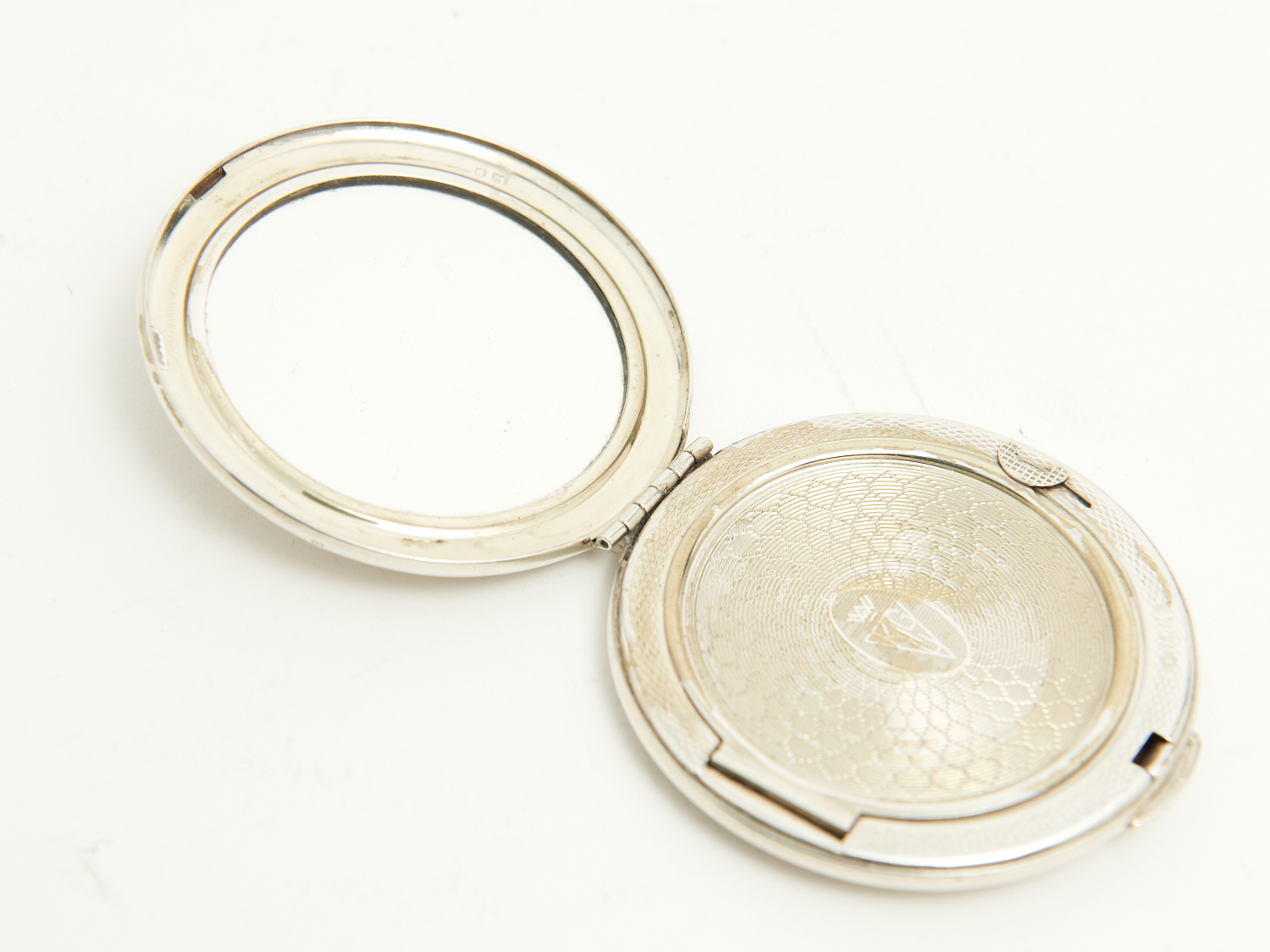 A STERLING SILVER GUILLOCHE DECORATED COMPACT WITH MIRROR DIA.6.2CM 68G (TOTAL WEIGHT), LEONARD JOEL DELIVERY SIZE: SMALL