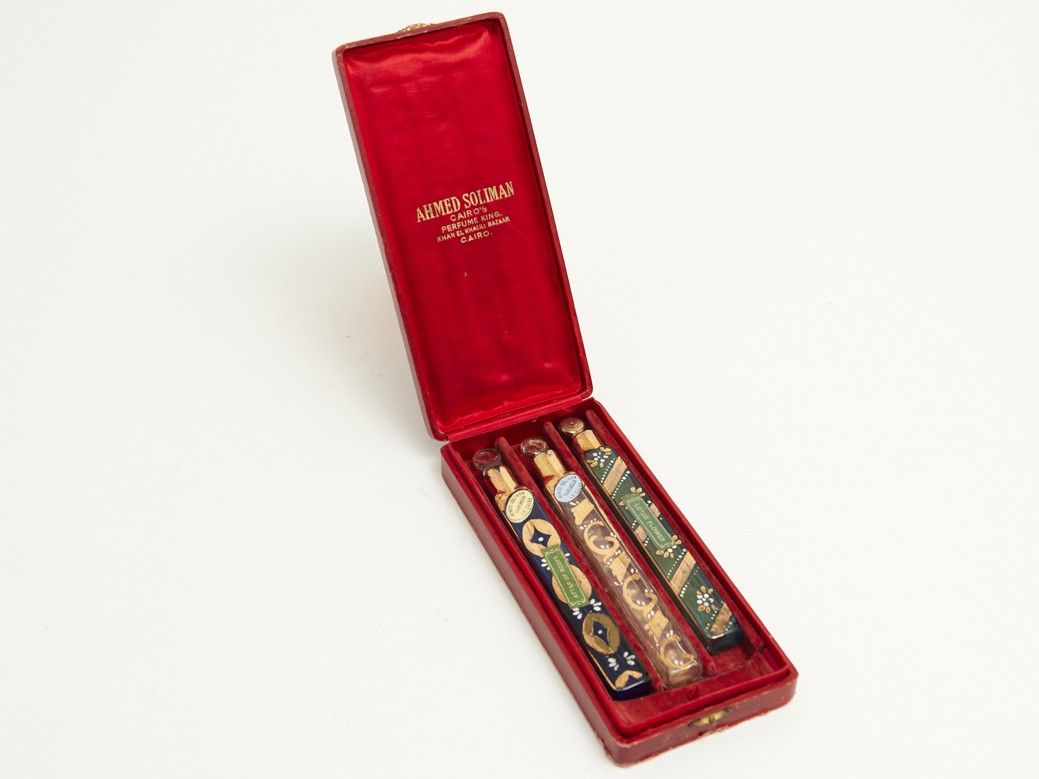 THREE CASED AHMED SOLIMAN EGYPT PERFUME BOTTLES FROM THE 1920S L.19CM (BOX), LEONARD JOEL DELIVERY SIZE: SMALL