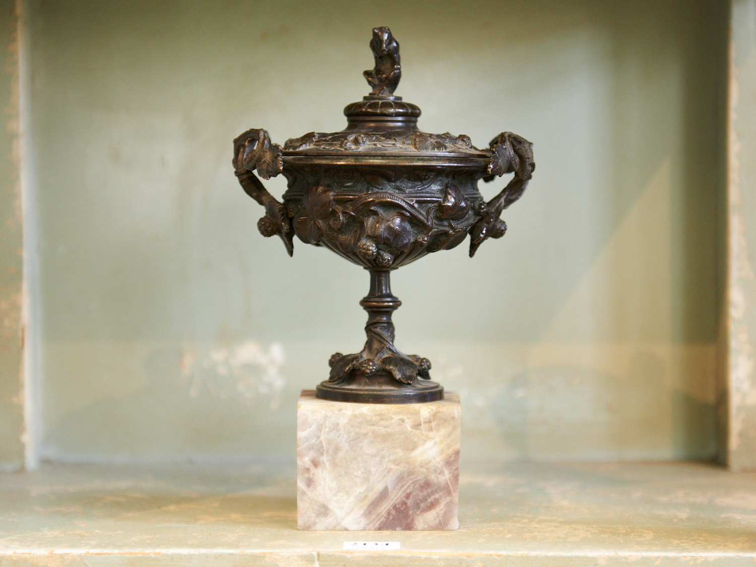 A FRENCH BRONZE URN ON MARBLE BASE H.23.5CM, LEONARD JOEL DELIVERY SIZE: SMALL