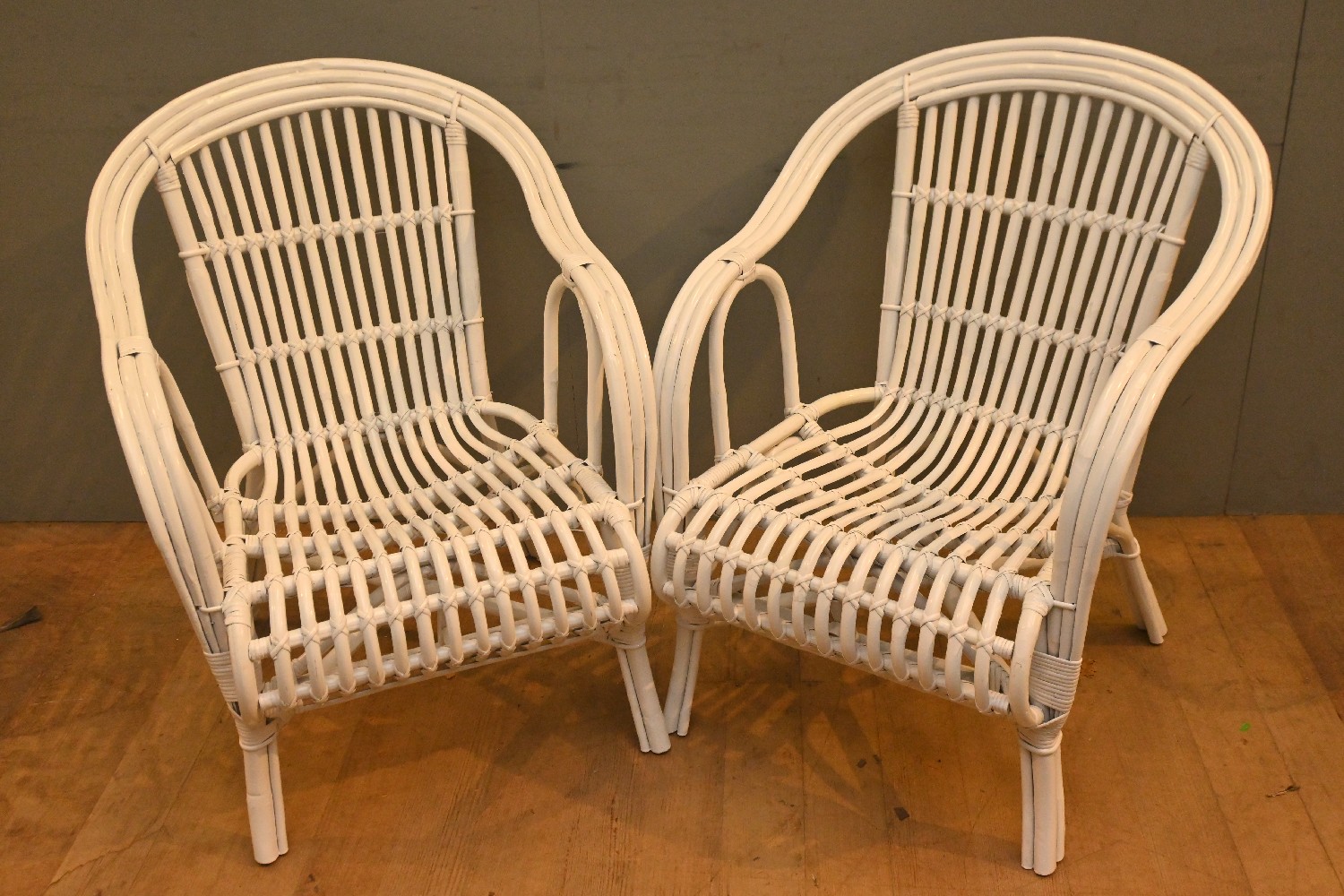 A PAIR OF WHITE PAINTED WICKER ARMCHAIRS (86H X 65W X 72D CM) (LEONARD JOEL DELIVERY SIZE: LARGE)