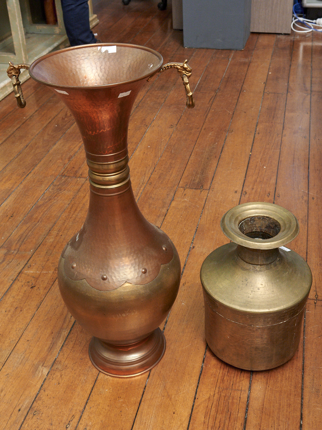 A FRENCH COPPER AND BRASS UMBRELLA HOLDER WITH A SMALLER BRASS VASE H.67CM (TALLEST), LEONARD JOEL DELIVERY SIZE: MEDIUM