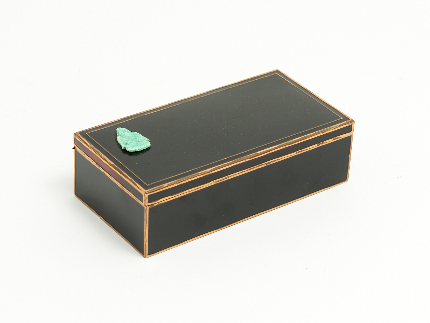 A CHINOISERIE ENAMELLED BRASS CIGARETTE BOX, WITH JADEITE PLAQUE TO LID L.18.5CM, LEONARD JOEL DELIVERY SIZE: SMALL