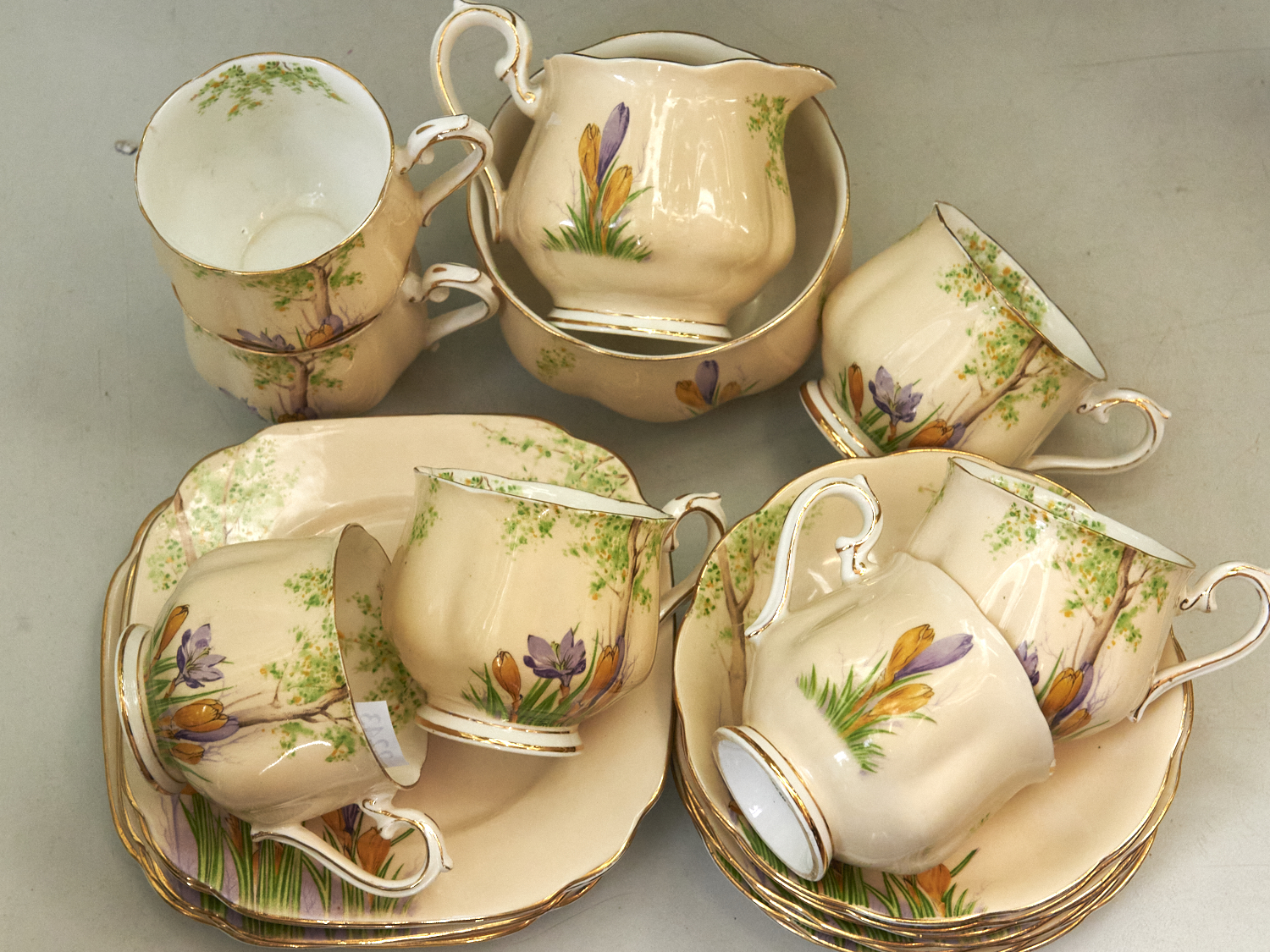 A 1930s ENGLISH PORCELAIN ROYAL ALBERT CROCUS PATTERN PART TEA SET H.10CM (JUG) (A/F), LEONARD JOEL DELIVERY SIZE: MEDIUM