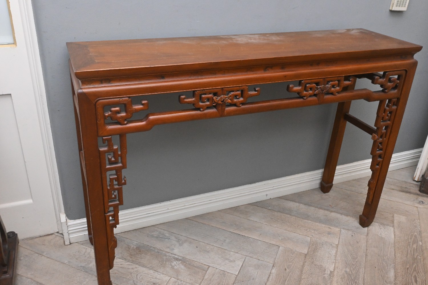 A 19th CENTURY CHINESE LONG NARROW TABLE, WITH FRETWORK APRON AND SPANDRELS (A/F) (111H X 158W X 43D CM) (PLEASE NOTE THIS HEAVY ITEM MUST BE REMOVED BY CARRIERS AT THE CUSTOMER'S EXPENSE. LEONARD JOEL STAFF CANNOT ASSIST CARRYING THIS ITEM) (LARGE ITEM)