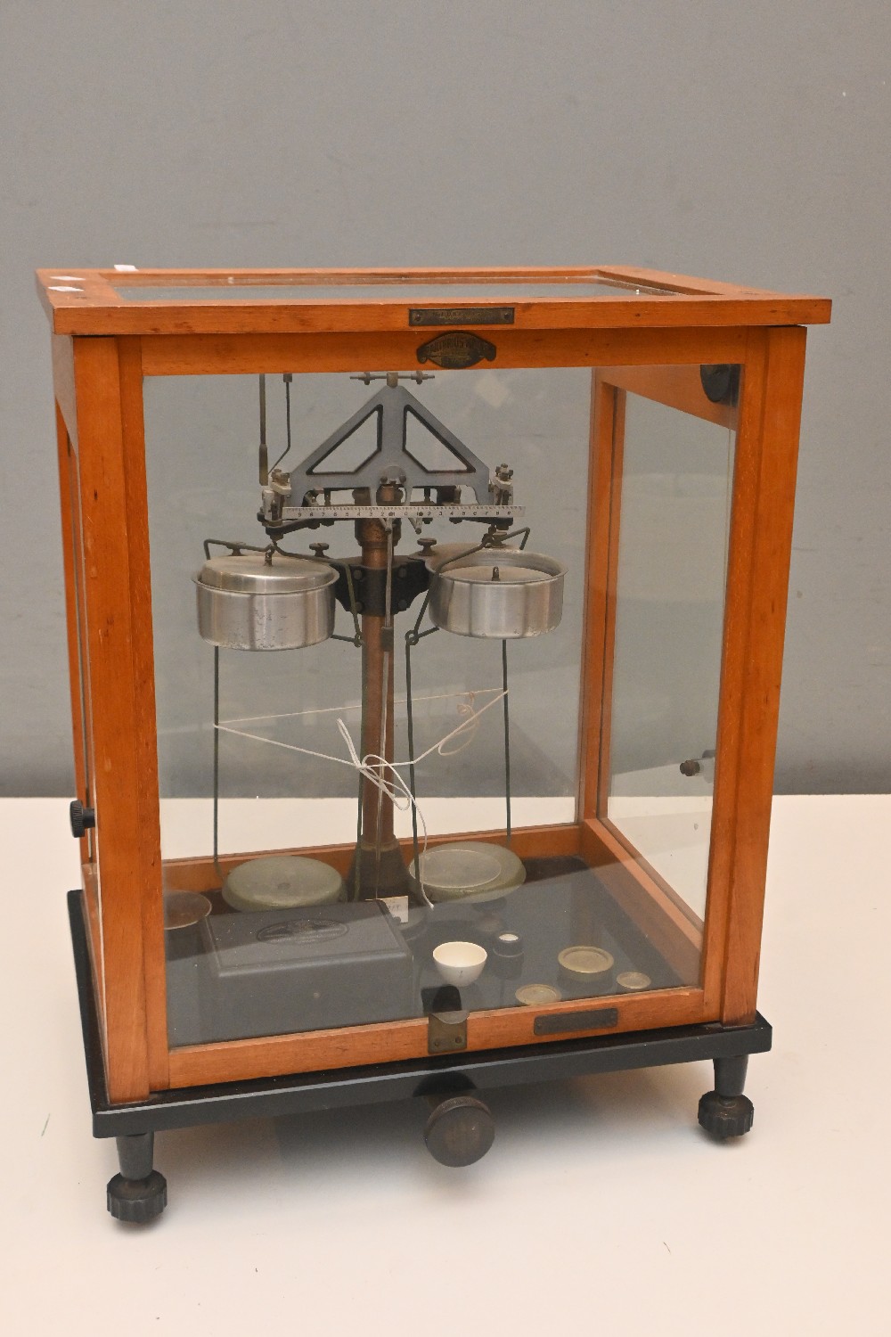 A SET OF LABORATORY SCALES IN A HARDWOOD-FRAMED GLAZED CASE (50H X 39W X 29D CM) (LEONARD JOEL DELIVERY SIZE: LARGE)