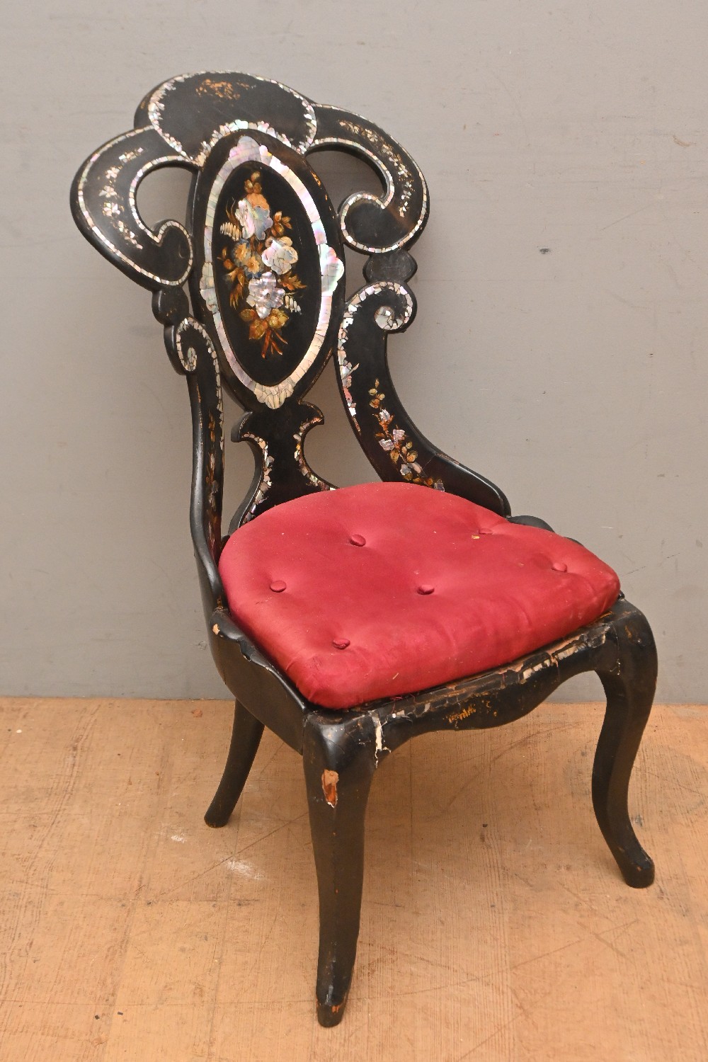 A VICTIORIAN EBONISED AND MOTHER OF PEARL-INLAID SIDE CHAIR (A/F) (90H X 50W X 62D CM) (LEONARD JOEL DELIVERY SIZE: LARGE)