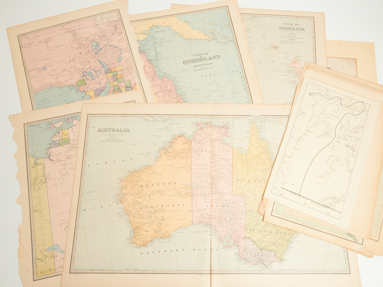 A COLLECTION OF 18 ANTIQUE AUSTRALIAN MAPS INCLUDING COLONIES OF WA, SA, TAS, NT (ALEXANDRA LAND), VIC, NSW 1833, C.1910 FROM THE COLLECTION OF THE LATE DR JOHN O'HAGAN AM, LEONARD JOEL DELIVERY SIZE: SMALL