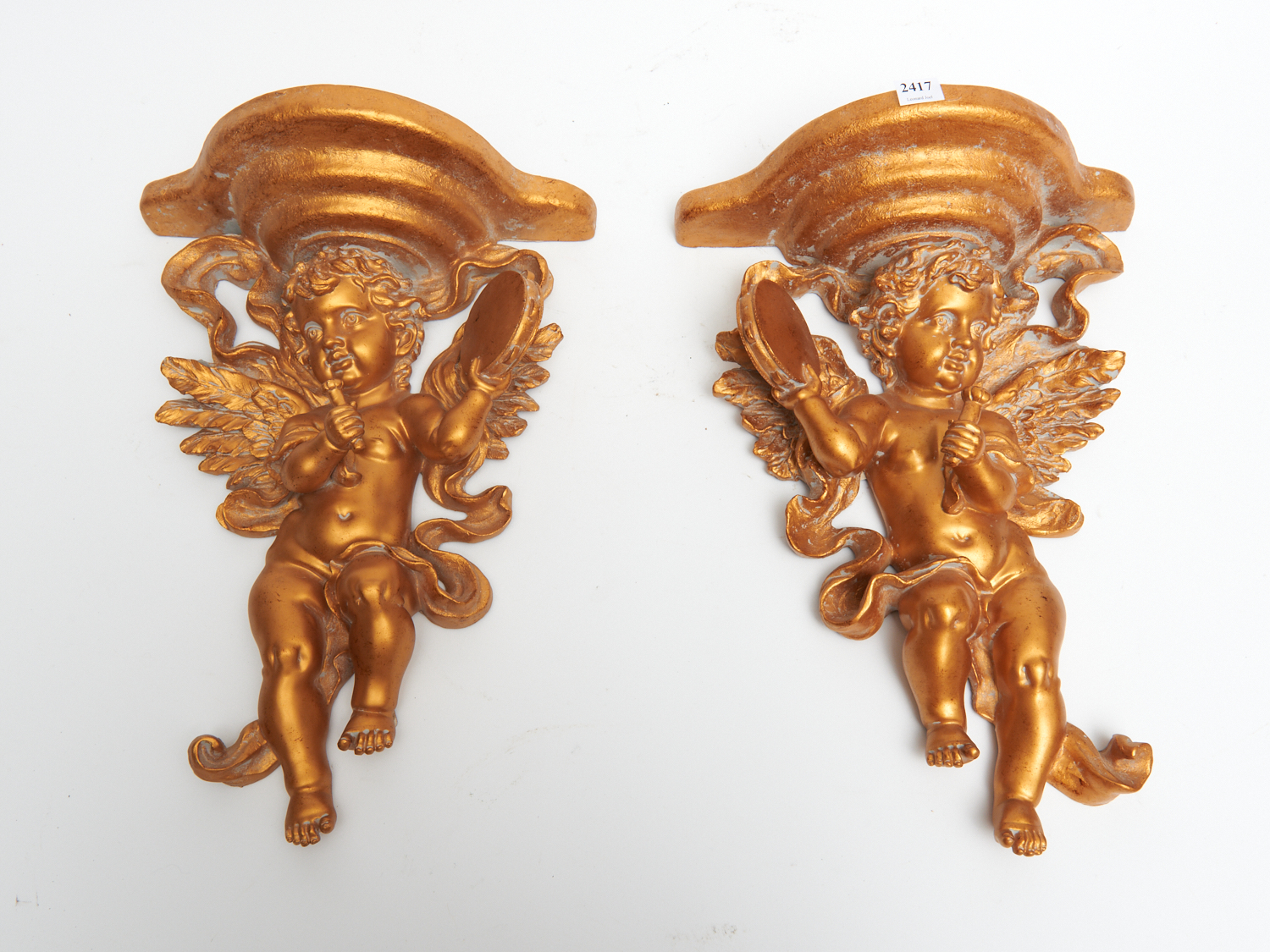 A PAIR OF GILDED PUTTI-FORM BRACKET SHELVES H.39CM, LEONARD JOEL DELIVERY SIZE: MEDIUM
