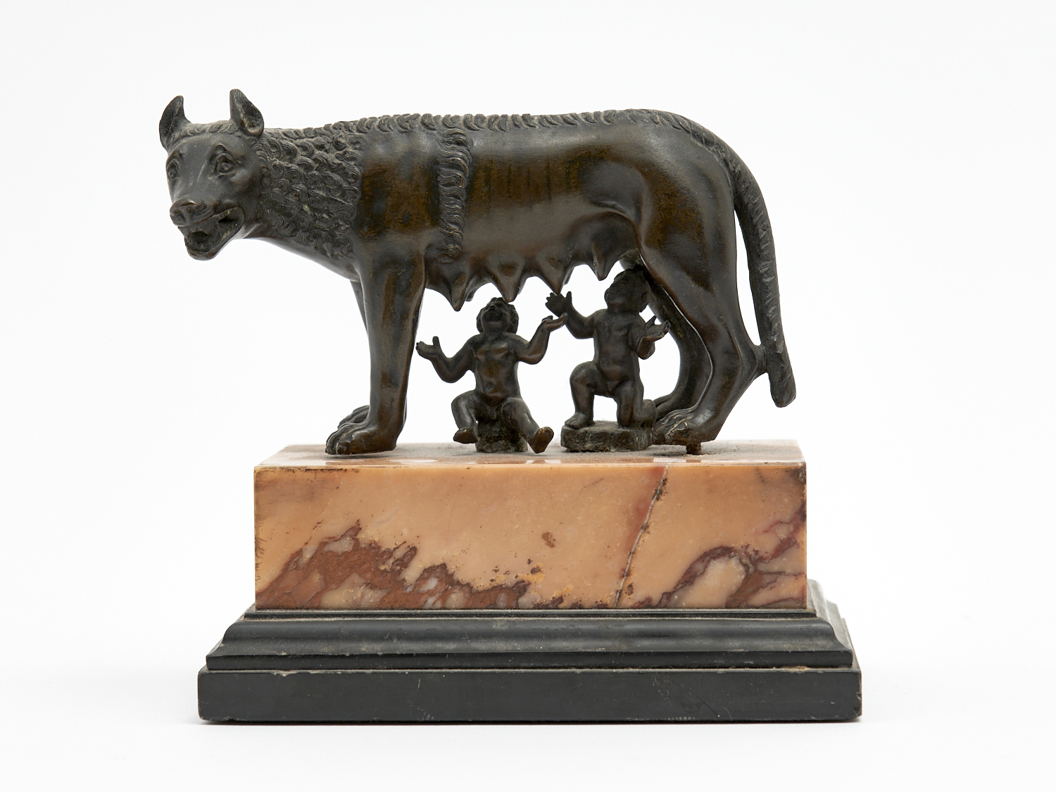 A BRONZE FIGURE OF THE CAPITOLINE WOLF ON MARBLE BASE L.15CM, LEONARD JOEL DELIVERY SIZE: SMALL