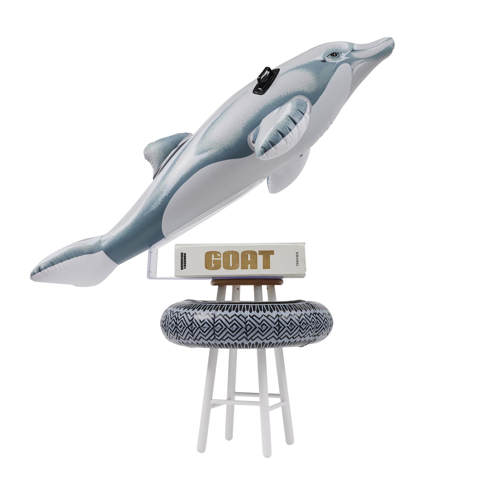 Case has scuffs and staining, paper envelope for limited edition photos has marks and staining and a small tear, book in good condition, photos in good condition, inflatable dolphin with double sided tape near underside of tail to attach to stand (can be easily removed).