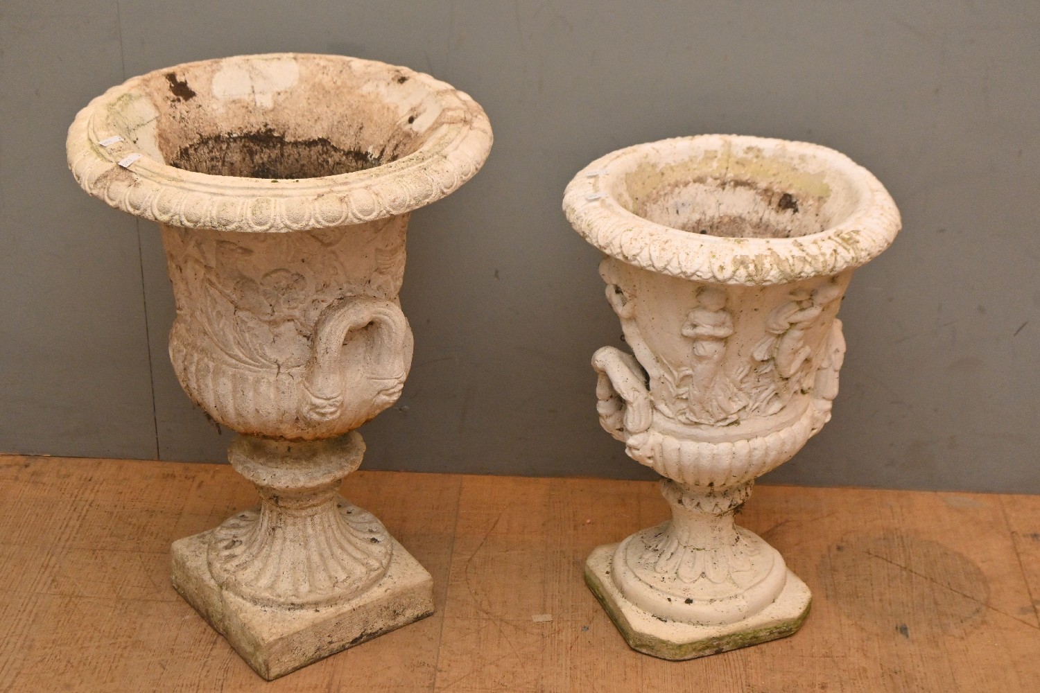 A PAIR OF VINTAGE CONCRETE URNS (A/F) (60H X 41D CM) (PLEASE NOTE THIS HEAVY ITEM MUST BE REMOVED BY CARRIERS AT THE CUSTOMER'S EXPENSE. LEONARD JOEL STAFF CANNOT ASSIST CARRYING THIS ITEM) (LARGE ITEM)