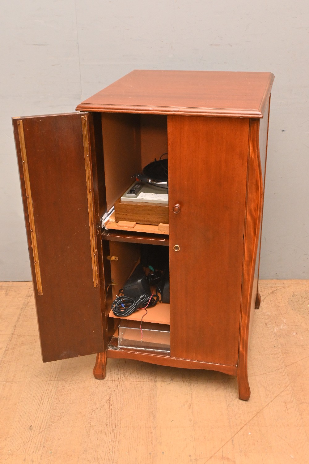 A 'HIS MASTERS VOICE' TWO DOOR RECORD CABINET (A/F) (90H X 47W X 55D CM) (PLEASE NOTE THIS HEAVY ITEM MUST BE REMOVED BY CARRIERS AT THE CUSTOMER'S EXPENSE. LEONARD JOEL STAFF CANNOT ASSIST CARRYING THIS ITEM) (LARGE ITEM)