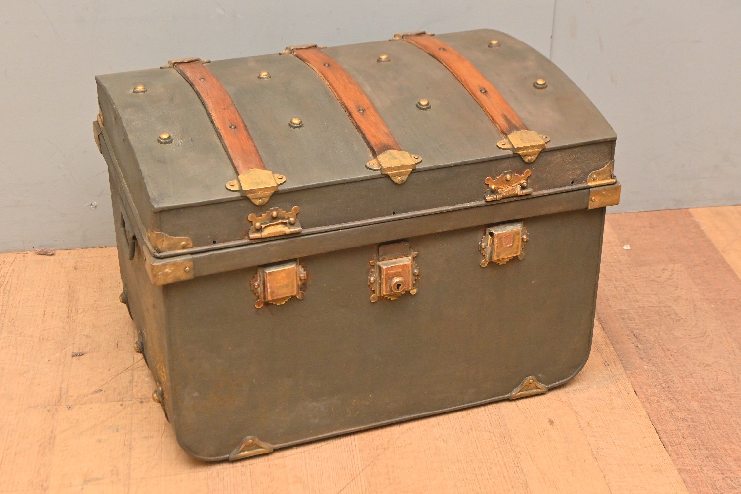 A VINTAGE TRAVELLING TRUNK (A/F) (45H X 63W X 45D CM) (LEONARD JOEL DELIVERY SIZE: LARGE)