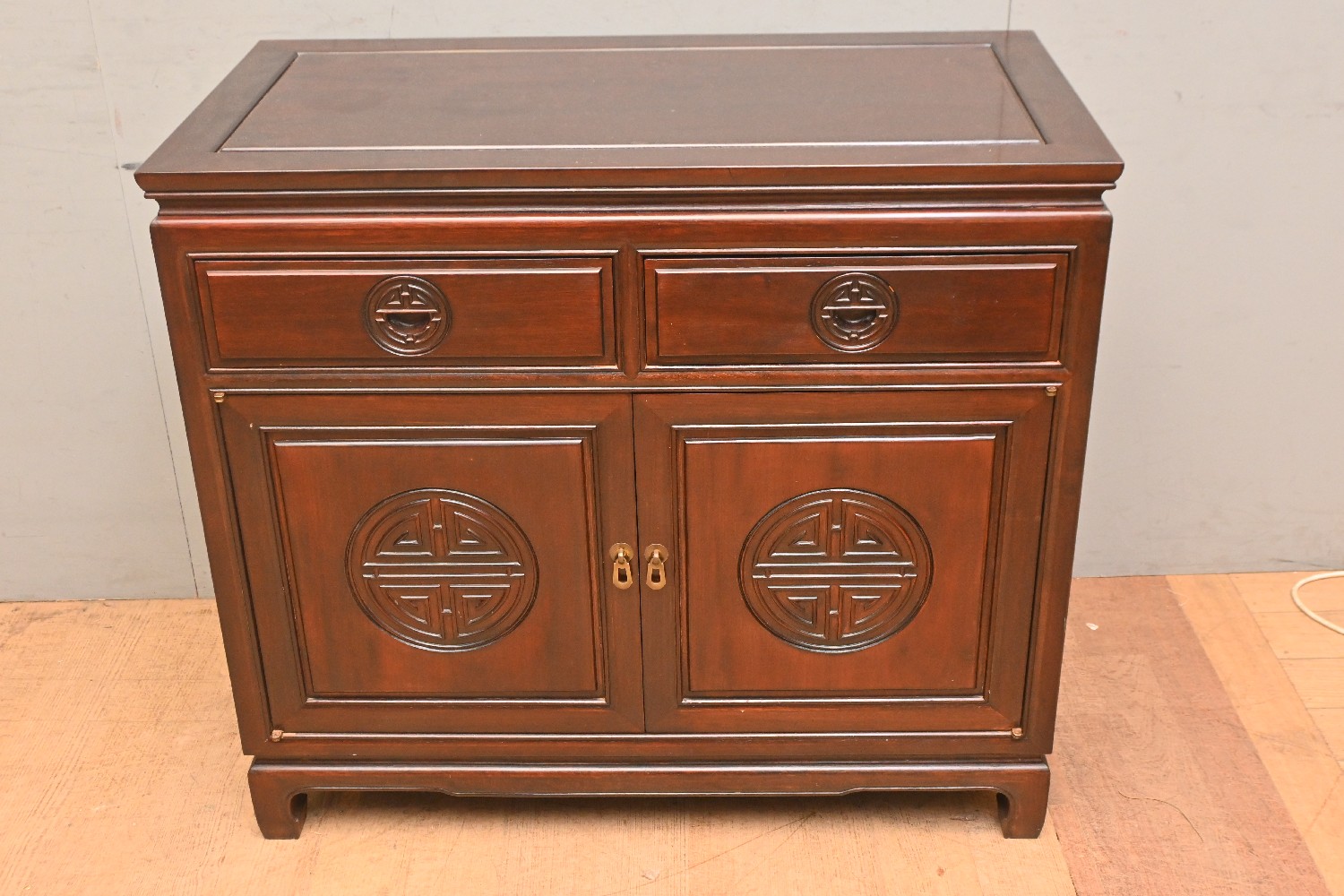 A CHINESE TWO DOOR CABINET (81H X 92W X 50D CM) (PLEASE NOTE THIS HEAVY ITEM MUST BE REMOVED BY CARRIERS AT THE CUSTOMER'S EXPENSE. LEONARD JOEL STAFF CANNOT ASSIST CARRYING THIS ITEM) (LARGE ITEM)