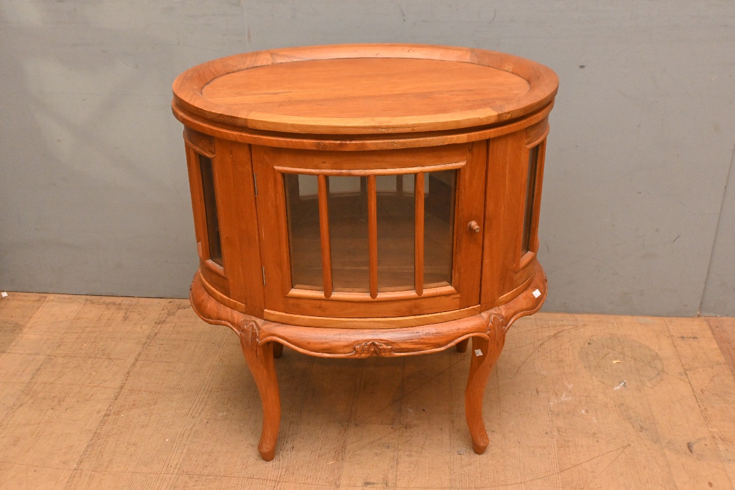 AN OVAL DRINKS CABINET WITH LIFT UP TRAY (73H X 69W X 46D CM) (LEONARD JOEL DELIVERY SIZE: LARGE)