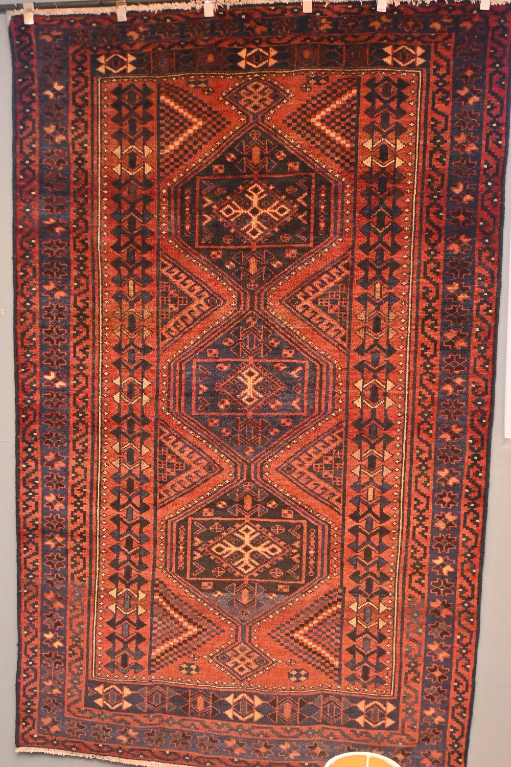 A TRIBAL PERSIAN OWLAD LURI RUG. 100% WOOL. NATURAL DYES, SEMI VINTAGE PILE, LARGE LIVING ROOM SIZE. HAND-KNOTTED TRIBAL WEAVE WITH DESIGN OF TRIPLE HEXAGONAL POLE MEDALLIONS CONTAINING TRIBAL MOTIFS ON A SOFT RED FIELD WITH ALL OVER STAR AND ROSETTES. BORDER OF STAR MOTIFS. ALL OVER TONES OF CHARCOAL, RUST, AND BLUE. EX GALLERY CONDITION. SIZE: 283 X 177 CM. ORIGIN: PERSIA - RRP: $3,800. DOCUMENTATION OF AUTHENTICITY INCLUDED.