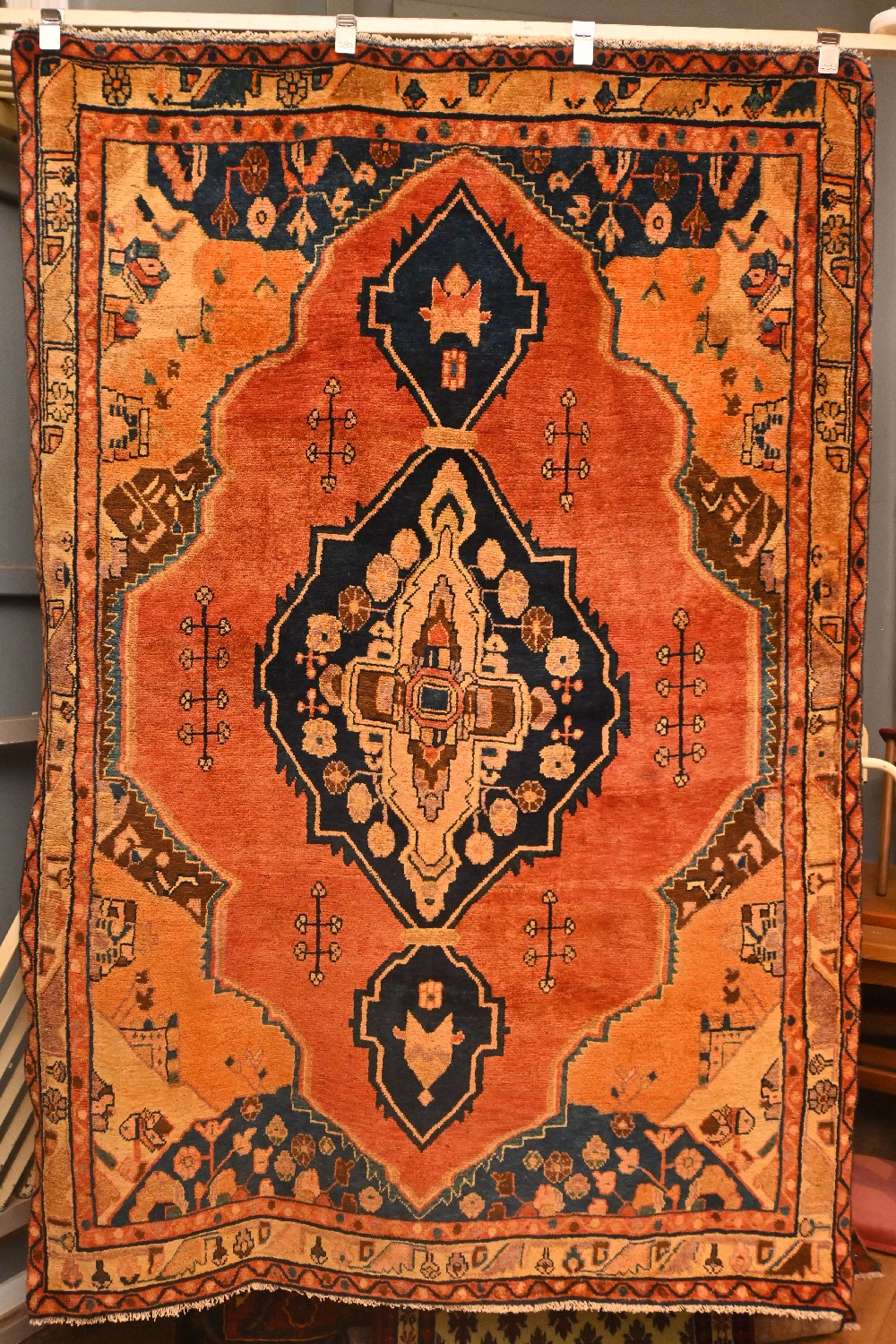 A PERSIAN CIRCA 1960'S KERMANSHAH RUG. HAND KNOTTED WITH 100% WOOL AND NATURAL DYES. SEMI VINTAGE PILE WITH A CENTRAL ANTIQUE STYLE ELONGATED MEDALLION ON A SOFT RED TONED FIELD WITH TREE OF LIFE MOTIFS. UNIQUE CORNER MEDALLIONS. BORDER OF TRIBAL AND FLORAL MOTIFS. FABULOUS ALL OVER COLOUR TONES. ORIGIN: PERSIA – RRP: $1,500- SIZE: 213 X 148 CM. DOCUMENTATION OF AUTHENTICITY INCLUDED.