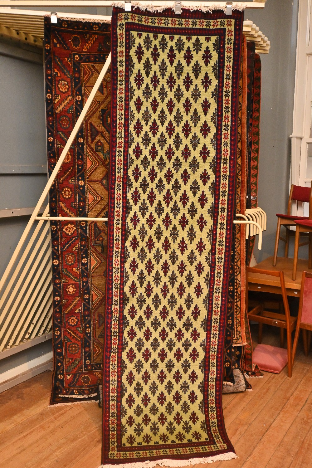 A TRIBAL PERSIAN BALOUCH NARROW HALL RUNNER, 100% FINE WOOL, SOLID AND DENSE. HAND-KNOTTED WEAVE FROM THE KHORASAN REGION WITH DESIGN OF ALL OVER LEAF FORM IN RED AND OLIVE BROWN ON A LIGHT PISTACHIO TONE FIELD. BORDER OF FLORAL TRIBAL MOTIFS. SIZE: 276 X 75 CM. ORIGIN: PERSIA – RRP: $1,200. DOCUMENTATION OF AUTHENTICITY INCLUDED.