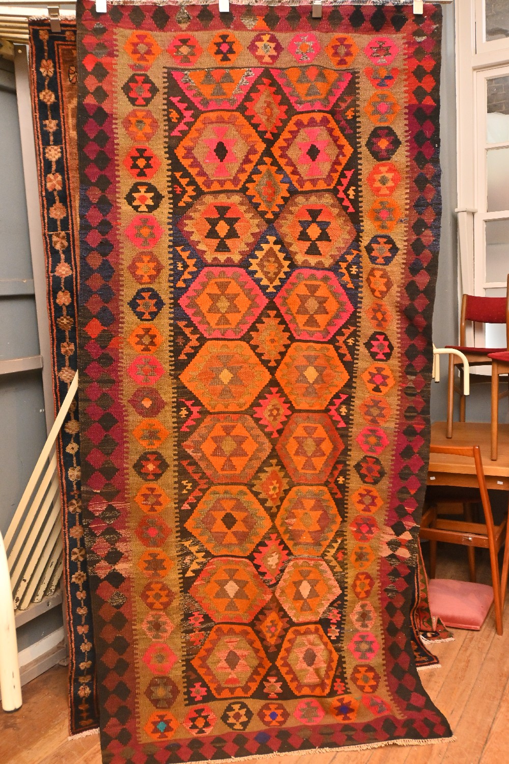 PERSIAN QASHQAI KILIM,100% WOOL WEAVE AND VEGETABLE DYES. SOLID AND REVERSABLE GEOMETRIC NOMADIC MOTIFS. SIZE: 283 X 125 CM – RRP -$950 ORIGIN: IRAN ORIGIN: PERSIA DOCUMENTATION OF AUTHENTICITY INCLUDE.