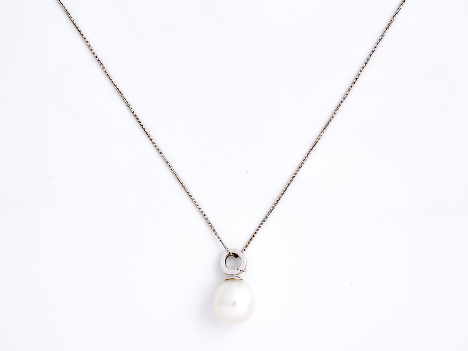 RUTHERFORD, A SOUTH SEA PEARL PENDANT ENHANCER IN 18CT GOLD TO A CHAIN IN 9CT WHITE GOLD