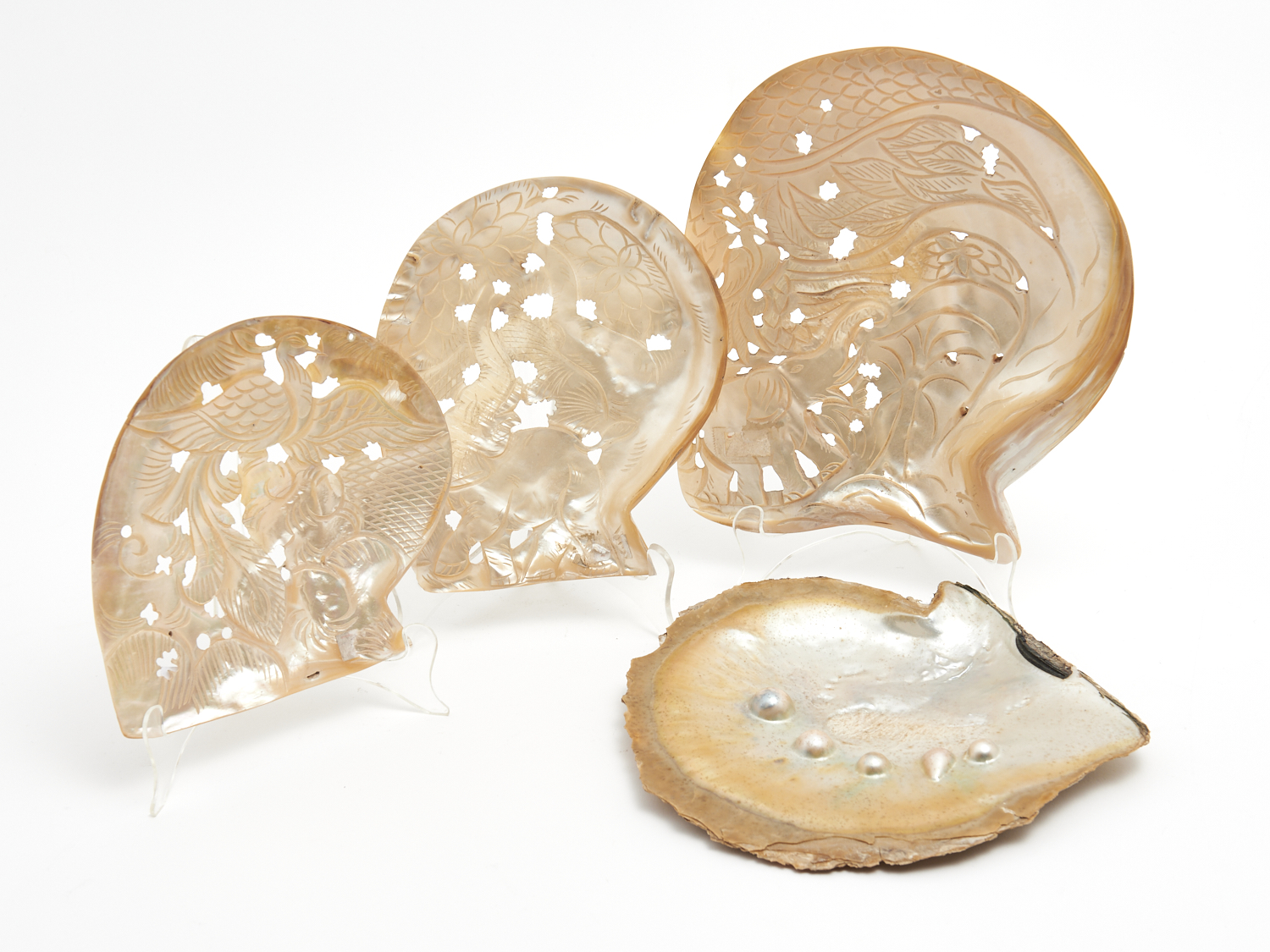A COLLECTION OF THREE CARVED ALABONE SHELLS AND ONE OTHER W.26CM (LARGEST), LEONARD JOEL DELIVERY SIZE: SMALL
