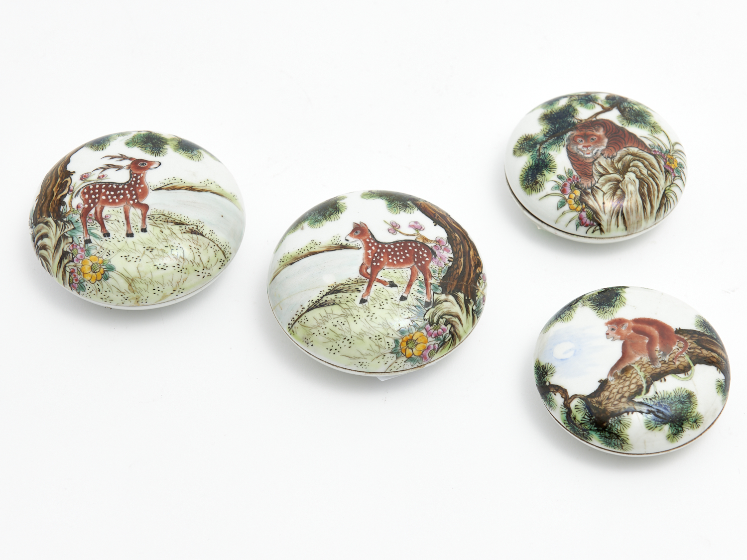 FOUR CHINESE PORCELAIN PASTE BOXES, EACH DECORATED WITH ANIMAL MOTIFS TO LID, FOUR CHARACTER CHOP MARK TO BASE DIA.8.5CM (LARGEST), LEONARD JOEL DELIVERY SIZE: SMALL