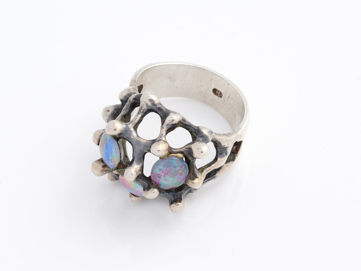 A VINTAGE ABSTRACT OPAL DOUBLET RING IN SILVER, SIZE N
