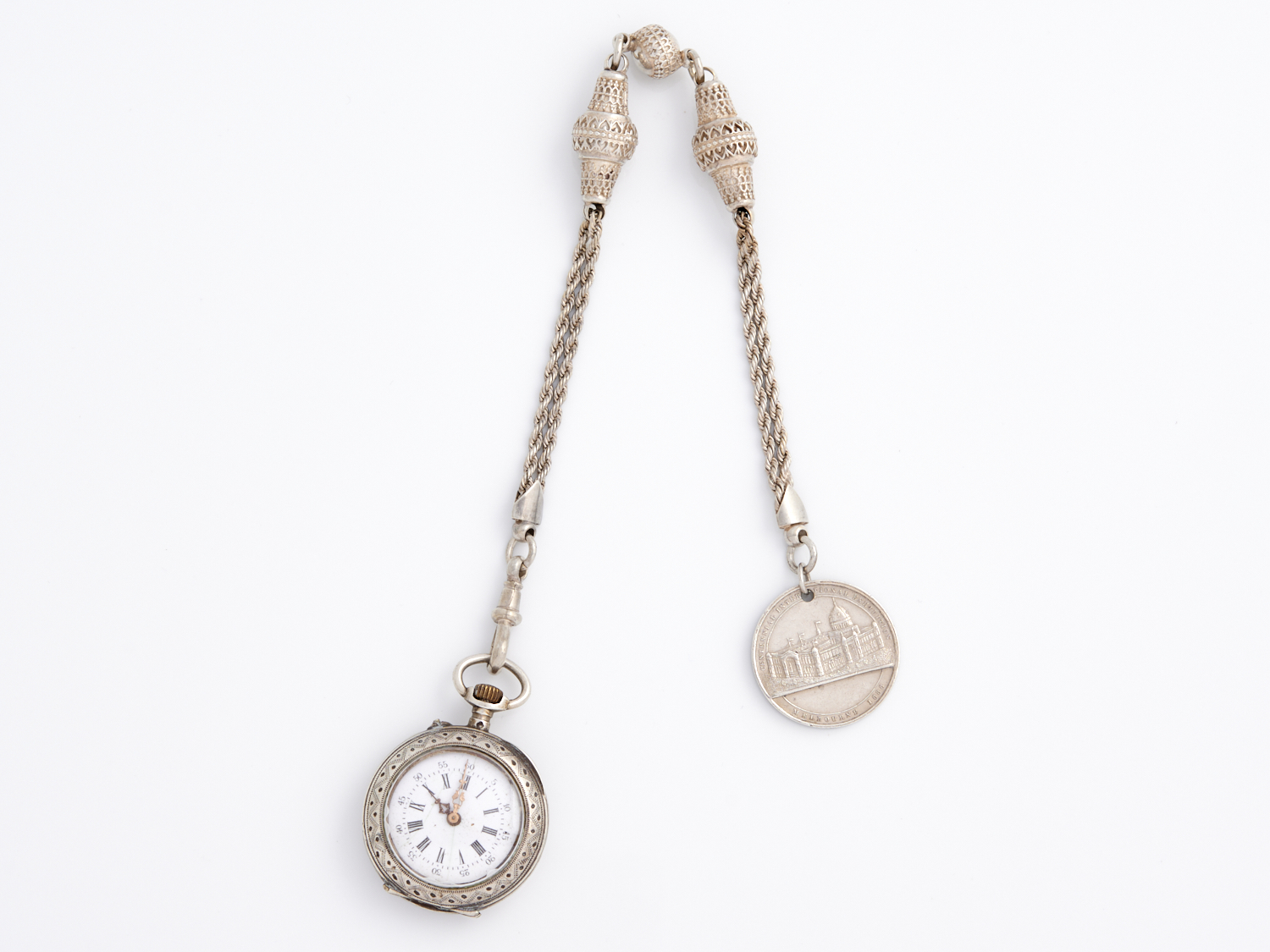 AN ANTIQUE ALBERTINA TO A FOB WATCH AND 1888 MELBOURNE EXHIBITION MEDAL IN SILVER, APPOXIMATELY 122MM