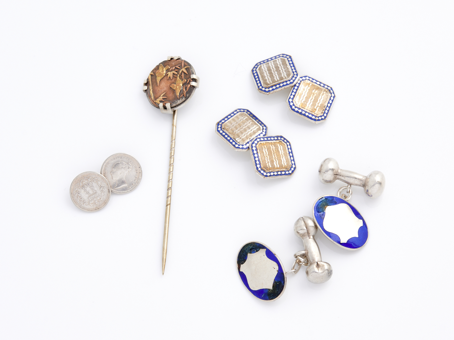 A COLLECTION OF JEWELLERY IN SILVER INCLUDING CUFFLINKS, STUDS AND A TIE PIN