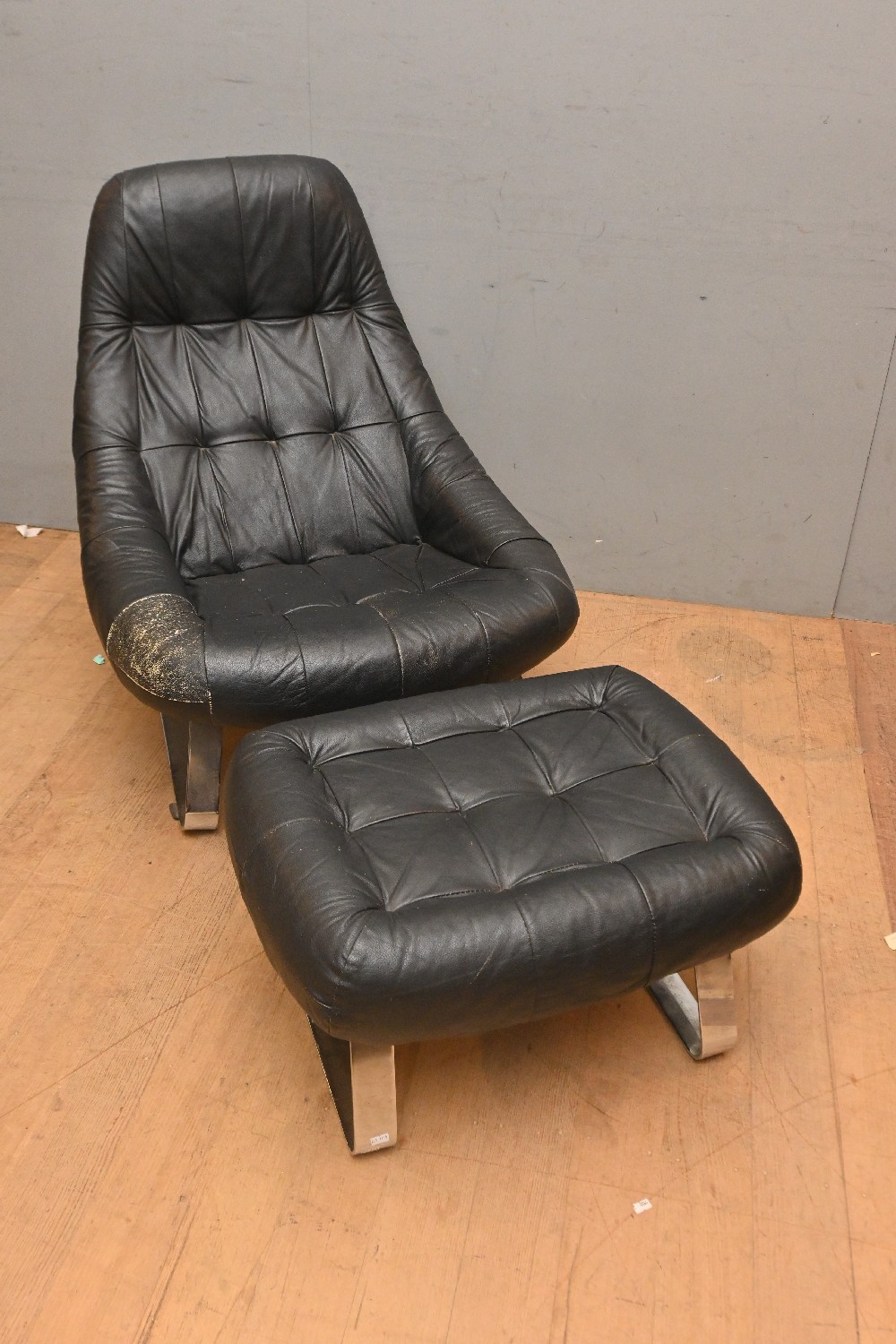 AN ORIGINAL EARTH CHAIR AND FOOTSTOOL BY PERCIVAL LAFER IN DARK BROWN LEATHER (A/F) (85H X 75W X 85D CM) (LEONARD JOEL DELIVERY SIZE: X-LARGE)