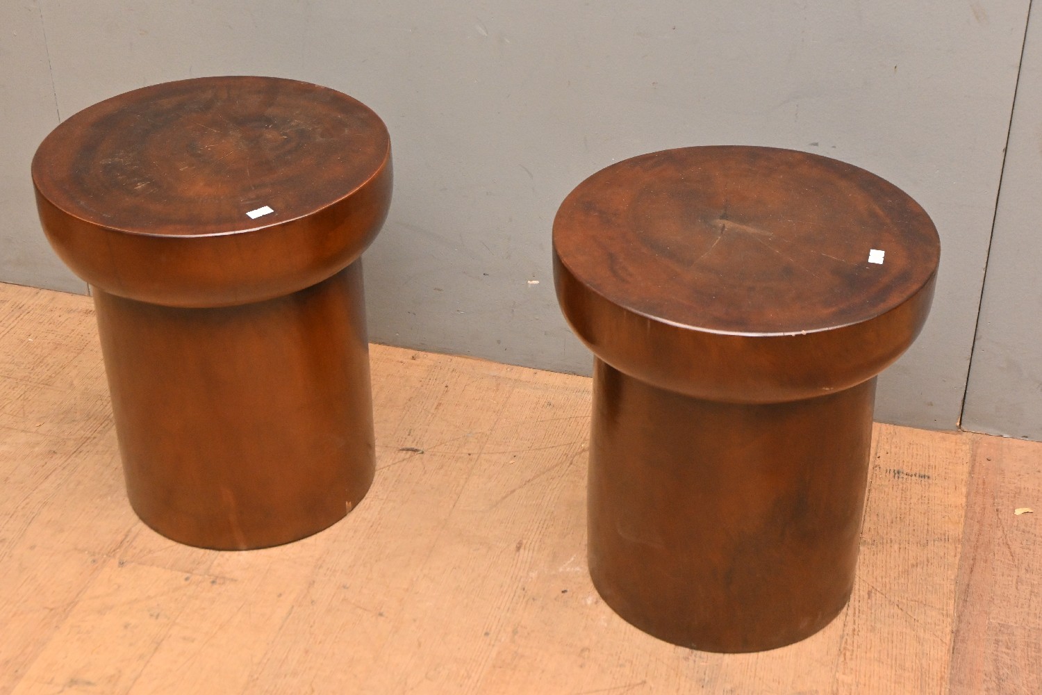A PAIR OF SOLID TEAK SIDE TABLES (A/F) (40H X 35D CM) (PLEASE NOTE THIS HEAVY ITEM MUST BE REMOVED BY CARRIERS AT THE CUSTOMER'S EXPENSE. LEONARD JOEL STAFF CANNOT ASSIST CARRYING THIS ITEM) (LARGE ITEM)