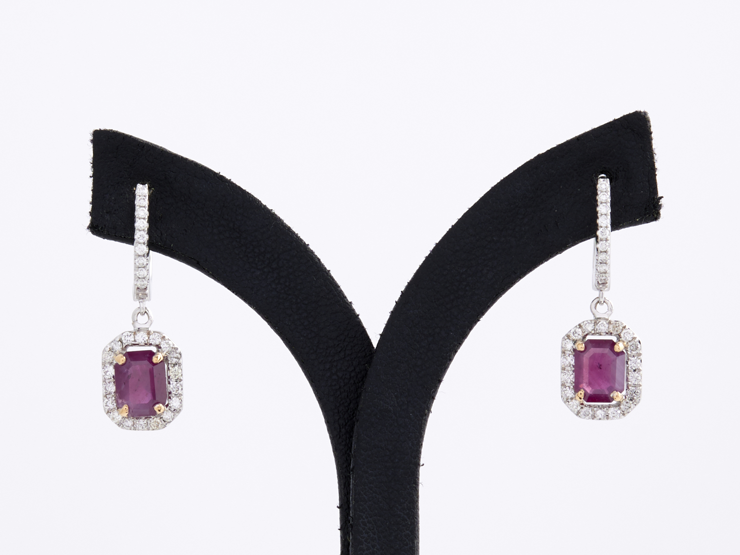 A PAIR OF UNHEATED RUBY AND DIAMOND EARRINGS IN 18CT TWO TONE GOLD, THE RUBIES WEIGHING 1.30CTS AND 1.10CTS, WITH DIAMONDS TOTALLING 0.56CT G/SI, TO POST AND LEVER BACK FITTINGS