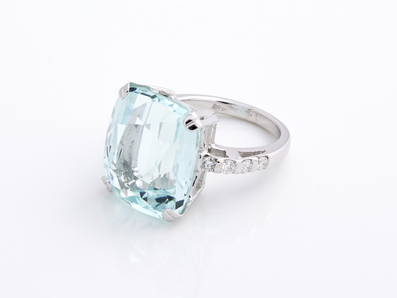 AN AQUAMARINE AND DIAMOND RING IN 18CT WHITE GOLD, THE AQUAMARINE WEIGHING 23.55CTS, THE DIAMONDS TOTALLING 0.62CTS, SIZE Q, ACCOMPANIED BY A VALUATION AND LABORATORY CERTIFICATE