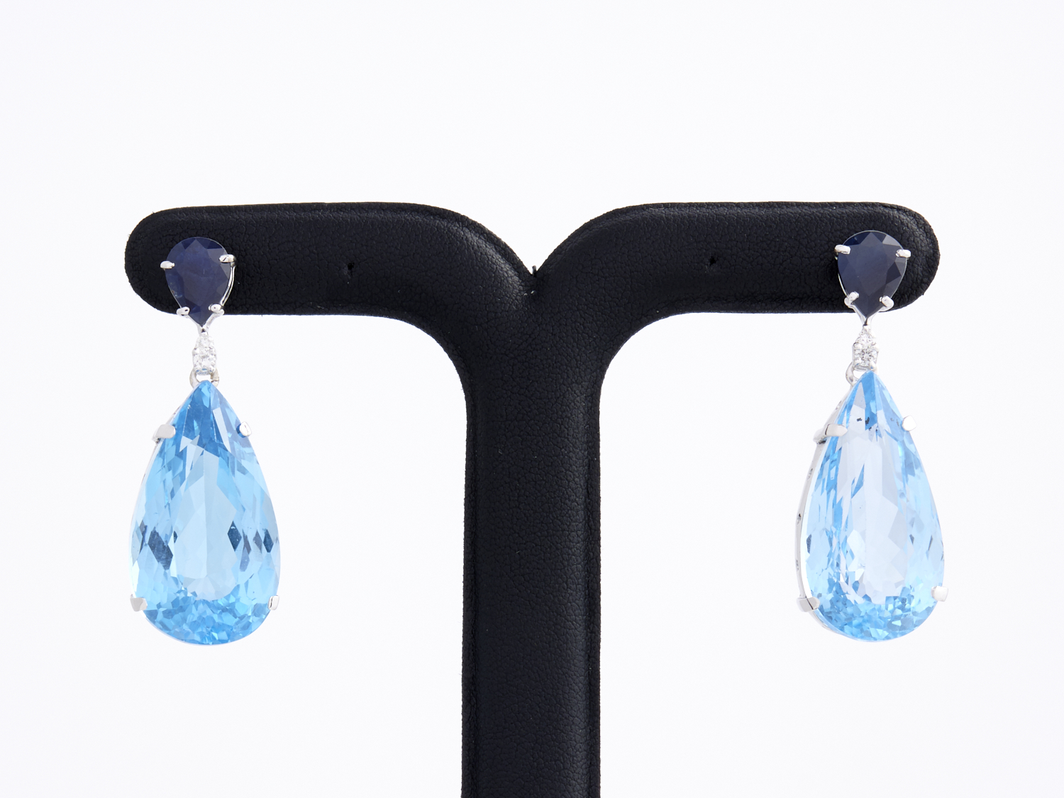 A PAIR OF TOPAZ, SAPPHIRE AND DIAMOND EARRINGS IN 18CT WHITE GOLD, THE TOPAZ WEIGHING 71.22CT, THE SAPPHIRES WEIGHING 3.46CT, AND DIAMONDS TOTALLING 0.16CTS, TO POST AND BUTTERFLY FITTINGS, LENGTH 42MM